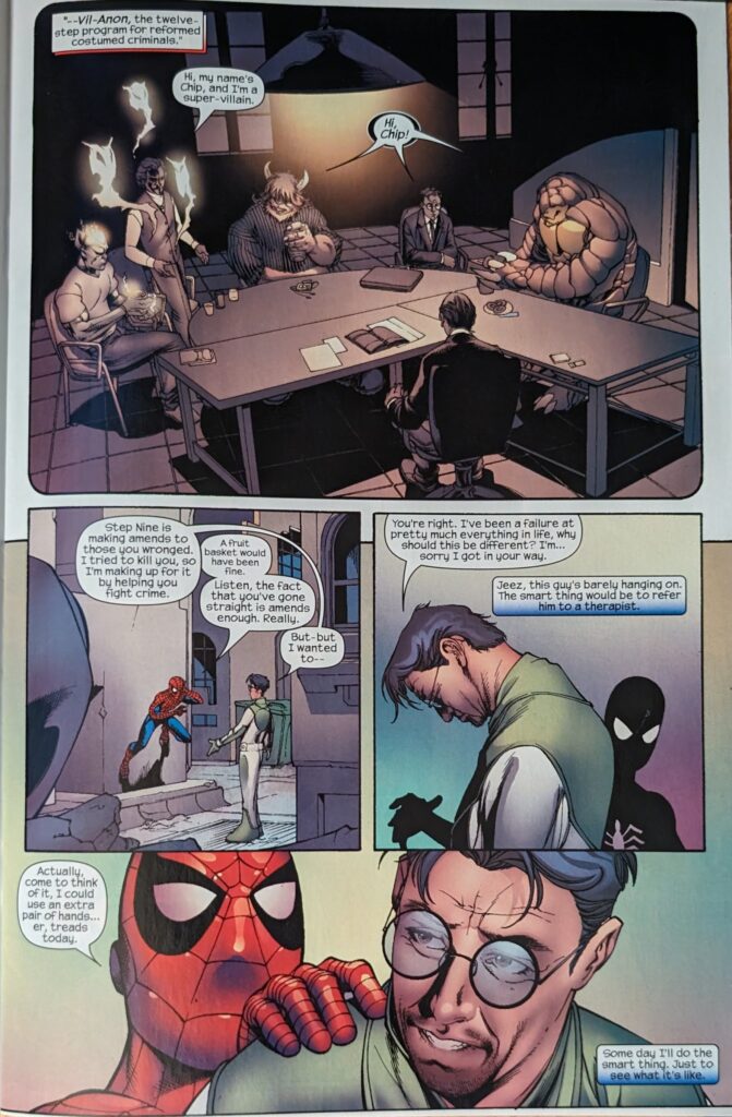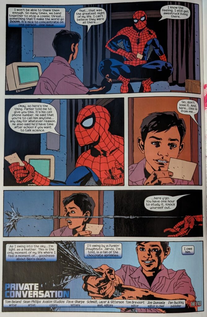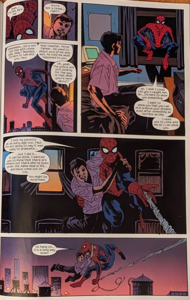 So, Peter is now telling MJ & May about this around a dinner table (While Jarvis cooks in the background), and May points out it’s all too similar to what happened to them. Peter says he knows, and isn’t sure he’ll be able to sleep tonight. He says he’s been thinking of going to visit Paul. Try to tell him he’s not alone and it’s not the end, but he’s just his teacher. Jarvis says Peter would be surprised how many of his fellow Avengers share this experience. Peter reminisces about how what a bright kid Paul is some more, including, perhaps inevitably, a time when Paul wondered aloud about how Spider-Man’s webbing works. So, we go to a week later, Spider-Man swinging, thinking Jarvis gave him an idea, but he wanted to give Paul some time alone. And then he appears at Paul’s window.