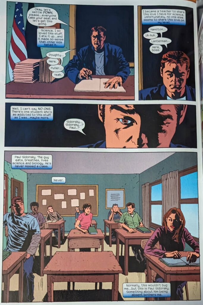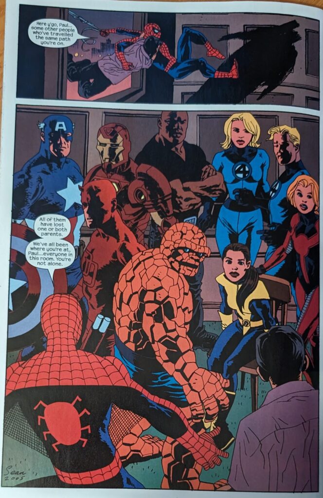 Sean Phillips doing some very weird faces here, wow. Well, the assembled superheroes take a 2-page spread to hang out with Paul and tell him their stories and offer advice and whatnot, which is all very sweet. A very different kind of heroes helping story. And then…