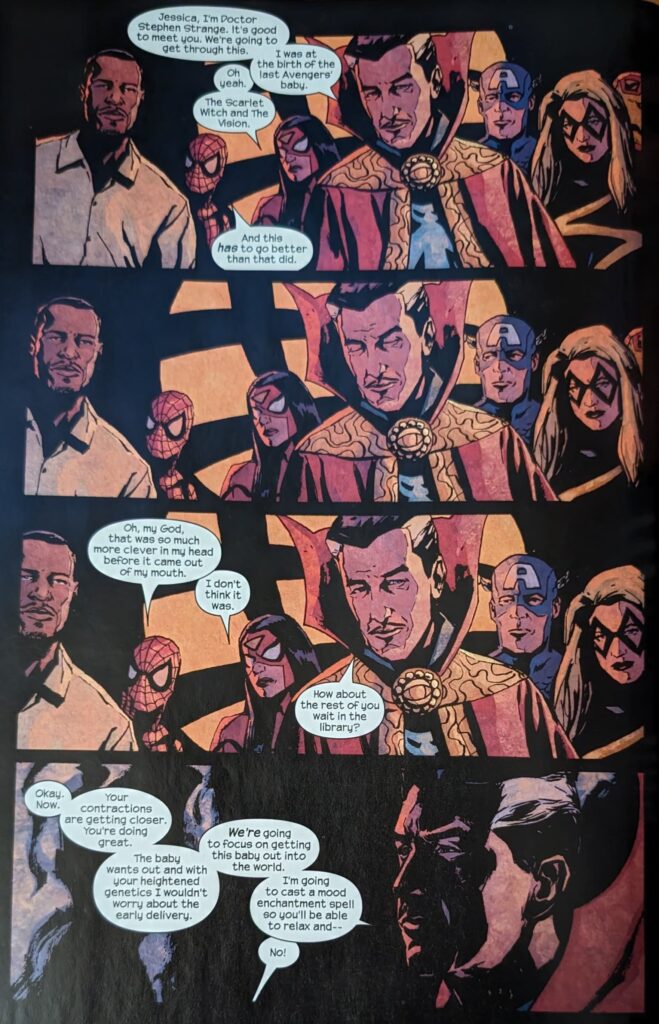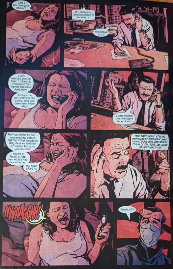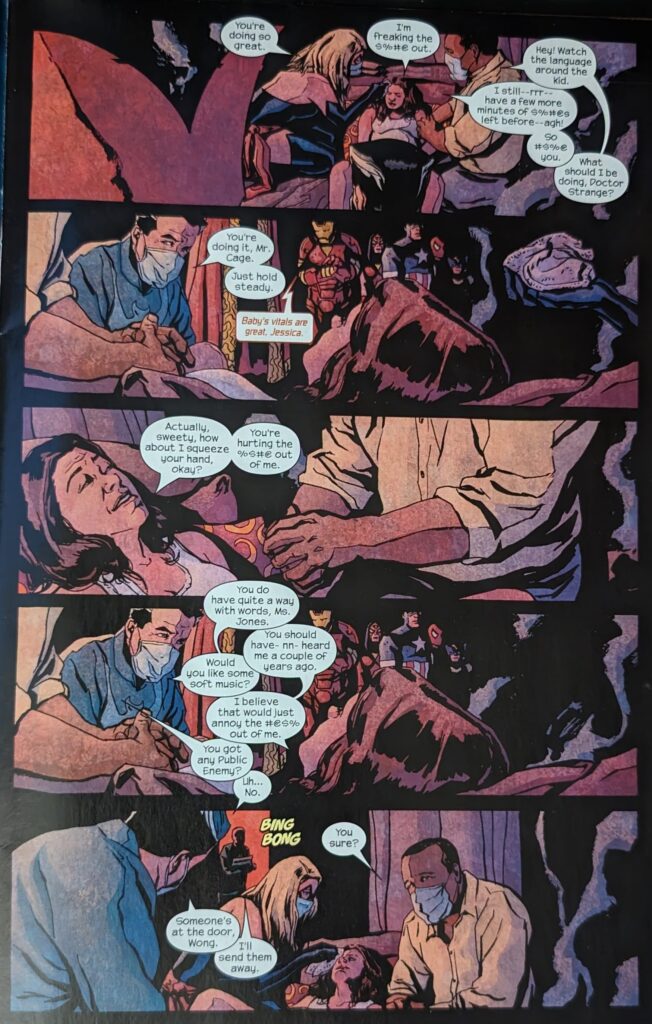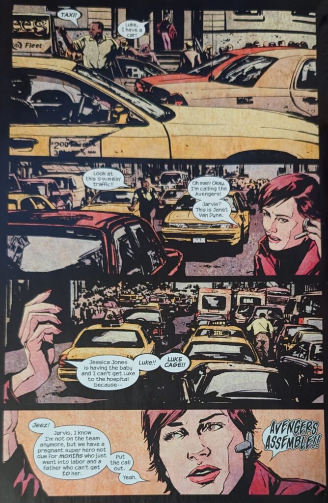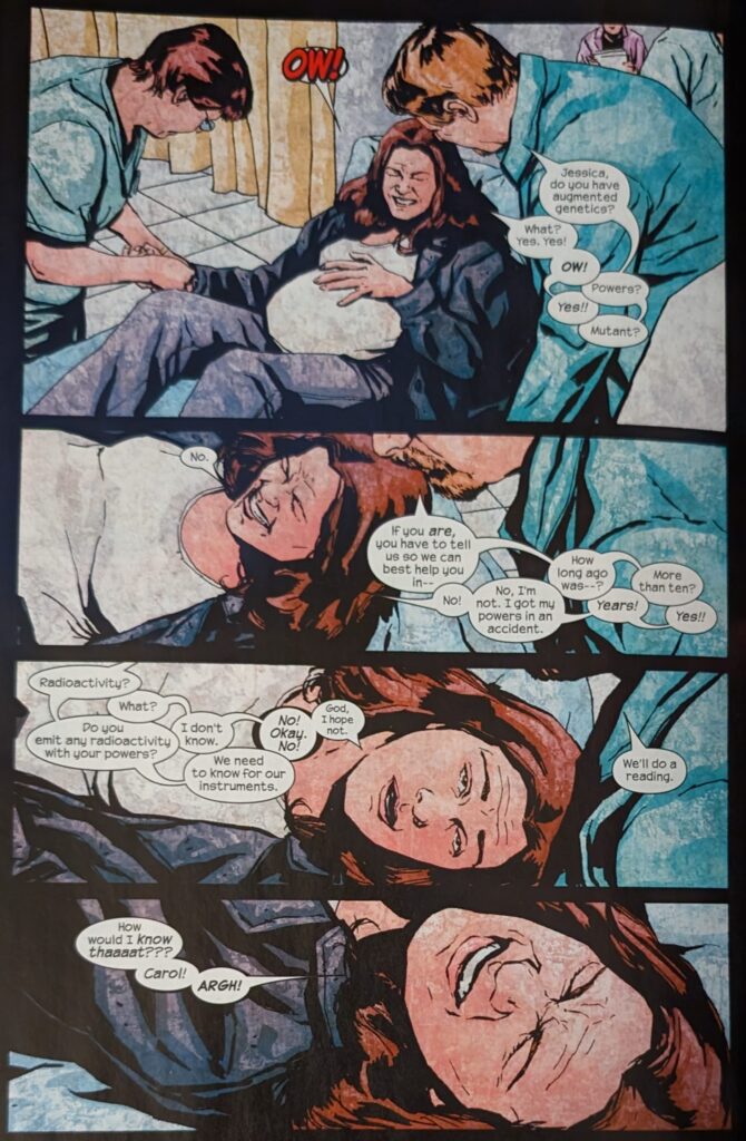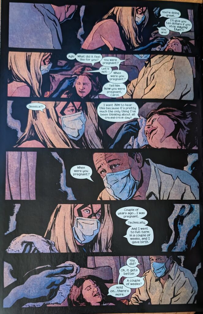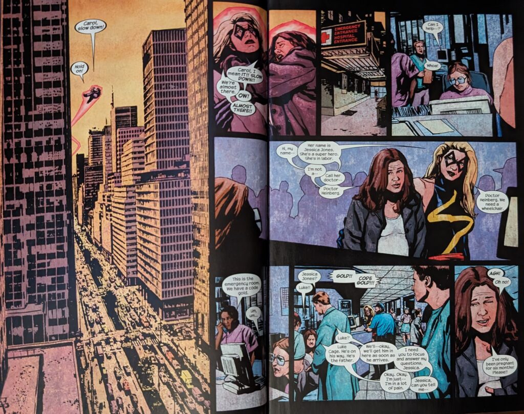 One thing I’ve found weird over the years is, Alias & the Pulse created a close, special friendship between Jessica and Carol. Of course Carol was with her, and of course she’s flying Jess to the hospital, they’re besties. But over the years, as Jessica Jones faded from the public eye and Carol Danvers toplined a lot of comics written by people who weren’t Bendis, that special friendship got transferred from Jessica Jones to Jessica DREW. Now everyone knows Carol Danvers and Jessica Drew are the best of friends, and Jessica Jones doesn’t come up too often. Just very strange. Anyway, Jessica is very premature, so that seems bad. Meanwhile: