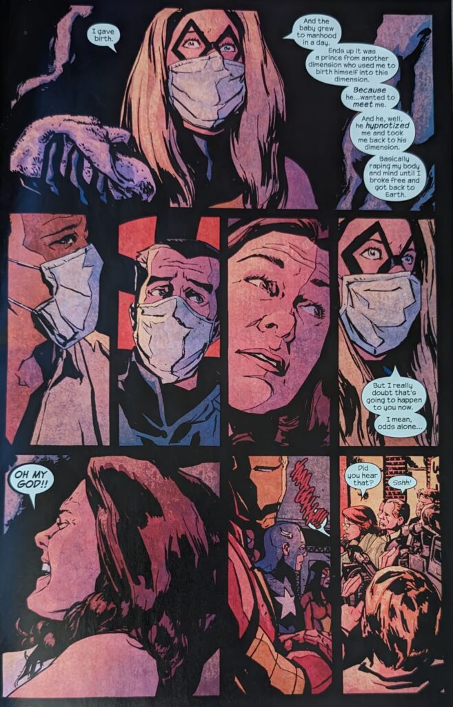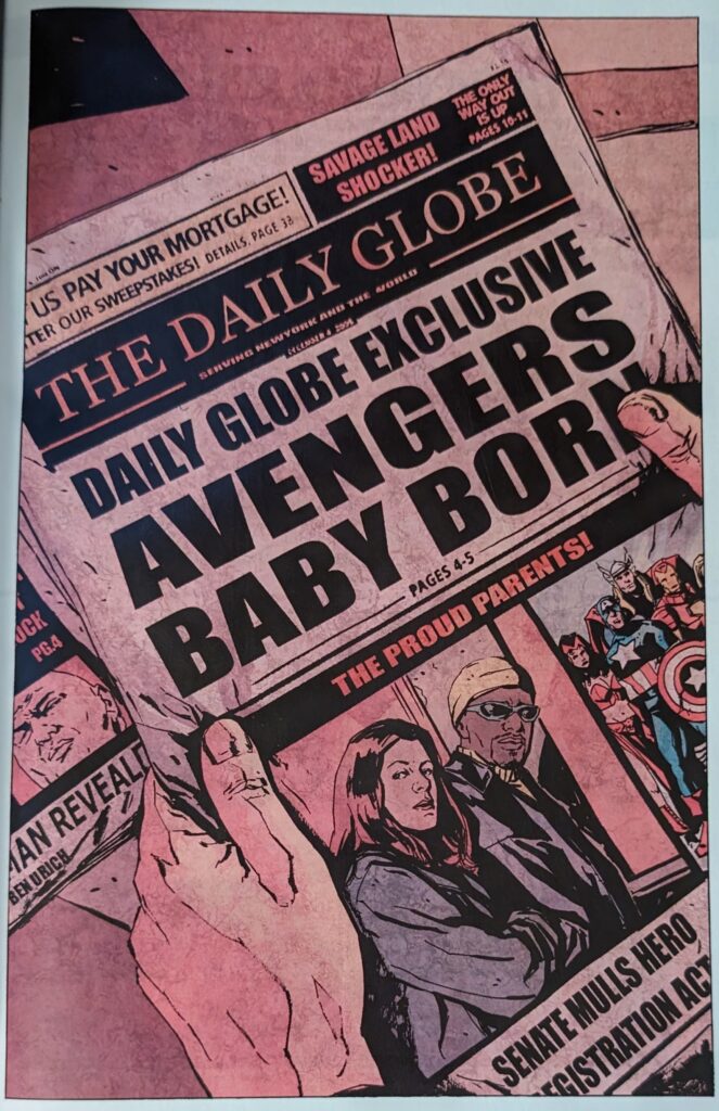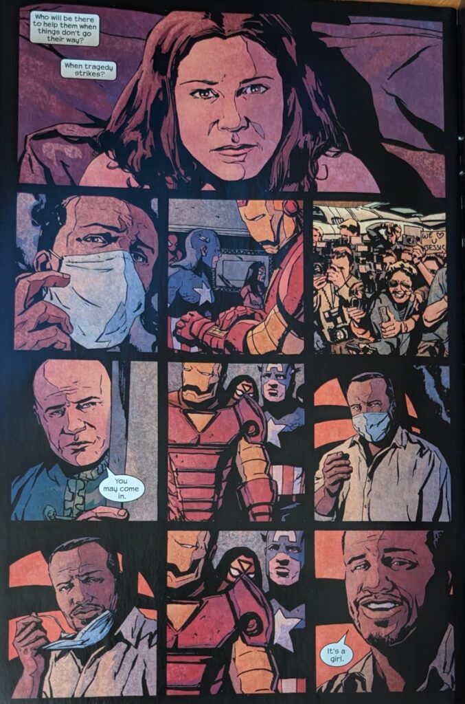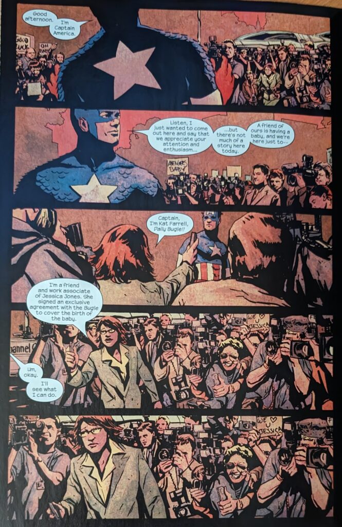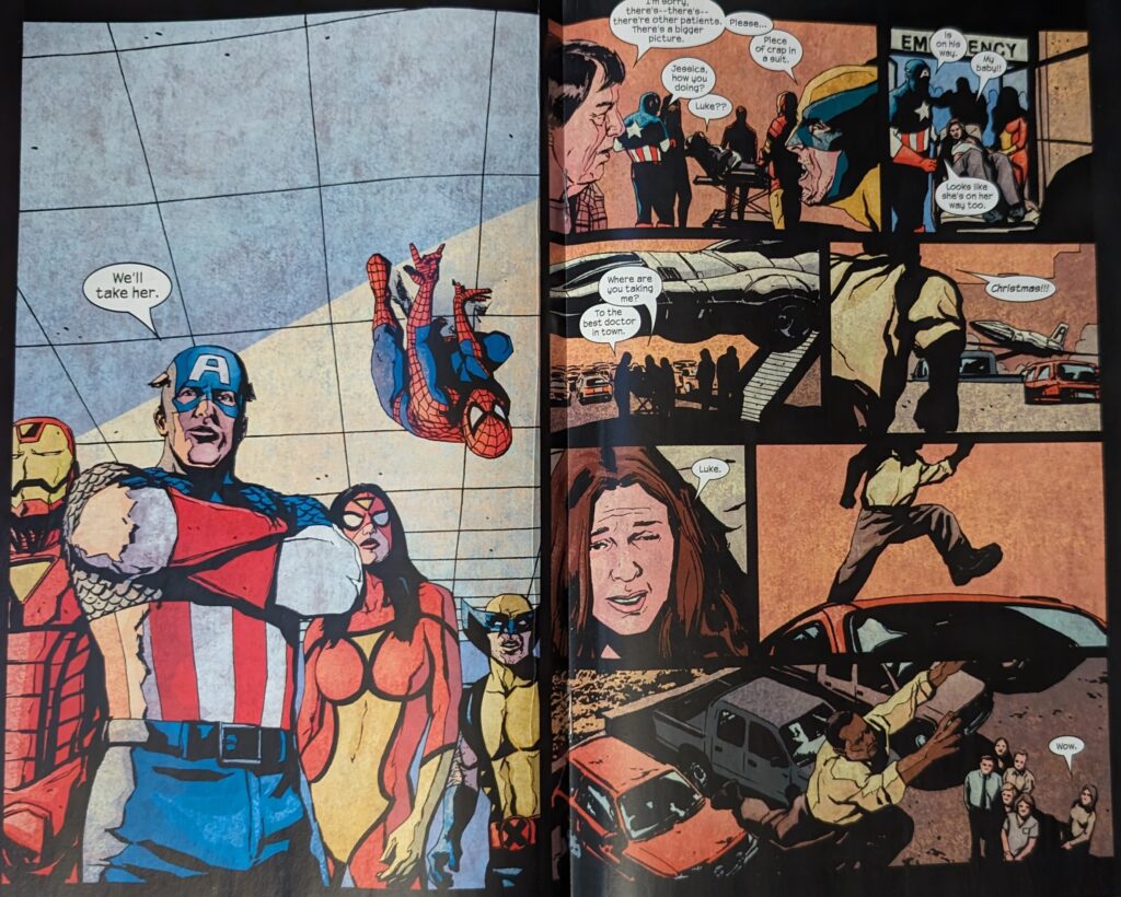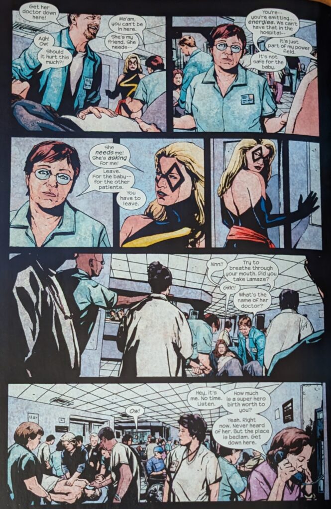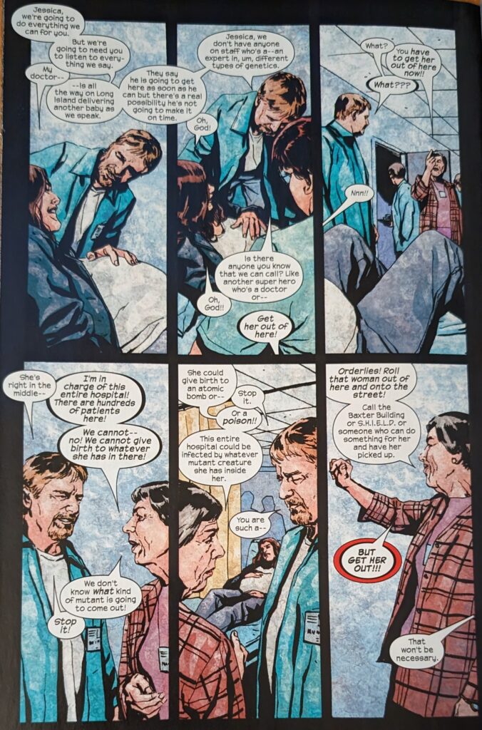 One thing I’ve found weird over the years is, Alias & the Pulse created a close, special friendship between Jessica and Carol. Of course Carol was with her, and of course she’s flying Jess to the hospital, they’re besties. But over the years, as Jessica Jones faded from the public eye and Carol Danvers toplined a lot of comics written by people who weren’t Bendis, that special friendship got transferred from Jessica Jones to Jessica DREW. Now everyone knows Carol Danvers and Jessica Drew are the best of friends, and Jessica Jones doesn’t come up too often. Just very strange. Anyway, Jessica is very premature, so that seems bad. Meanwhile: