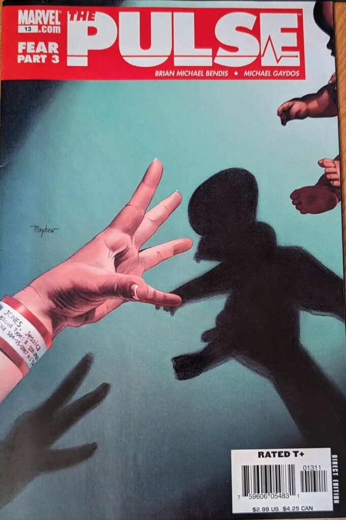 Pulse. Pulse, Pulse, Pulse. Where did we go wrong? The first arc was such a nice setup. We’d have Jessica and Ben Urich exploring the Marvel Universe. That was a good idea. And then… we didn’t. Issues 6-9 were a Secret War tie-in, issue 10 was a House of M tie-in, then there was 1 more arc, and then it was over. That arc even reunited the Alias team, bringing Jessica Jones and her cast back to their true, familiar faces. But when the smoke cleared, it was 14 issues, and only 9 of them were really about The Pulse. At any rate, in #11, Stuff Was Happening, and Janet Van Dyne was trying to get Luke Cage to choose a new superhero suit, when Jessica Jones’ water broke. After being pregnant for like 2 years’ worth of comics, the big moment was coming. And that’s where we pick things up here, in part 2 of “FEAR.” Terrible cover. Mike Mayhew has made a long career out of these too clean, too stiff photoreal paintings. Art that looks real and incredibly fake at the same time. But inside, like I said, it’s Bendis, Michael Gaydos and Matt Hollinsworth back together.