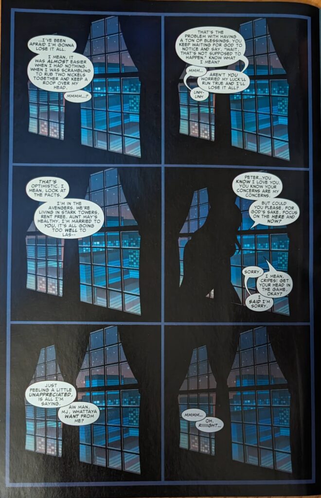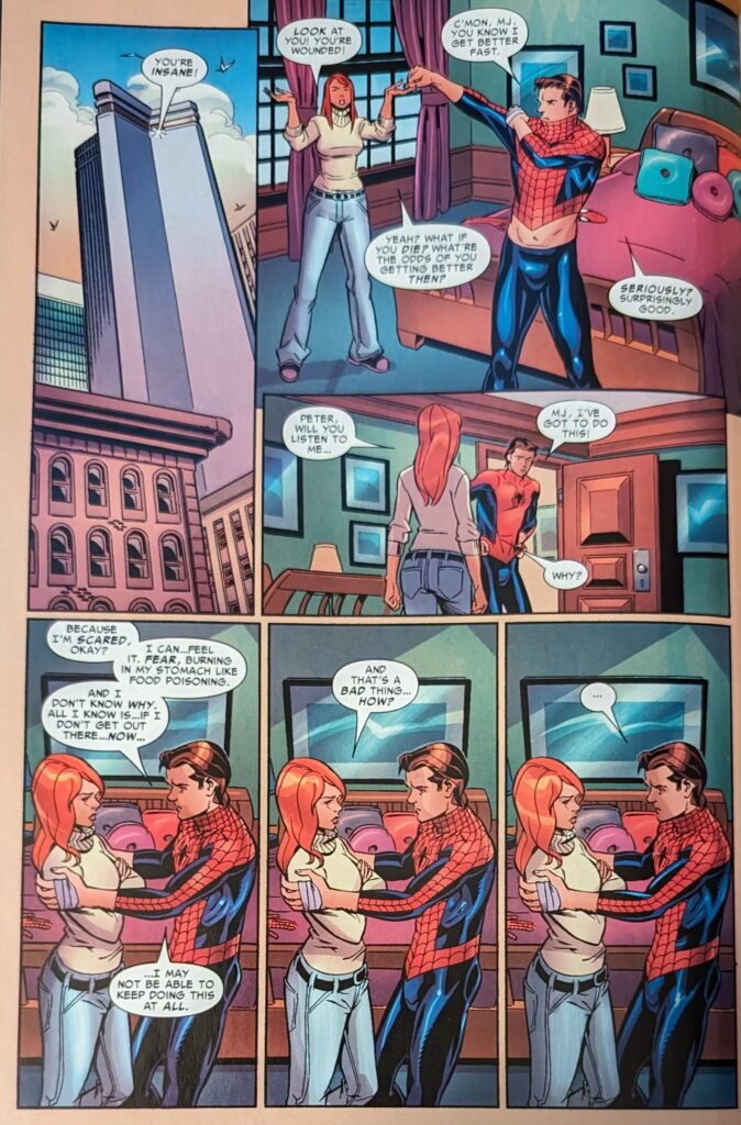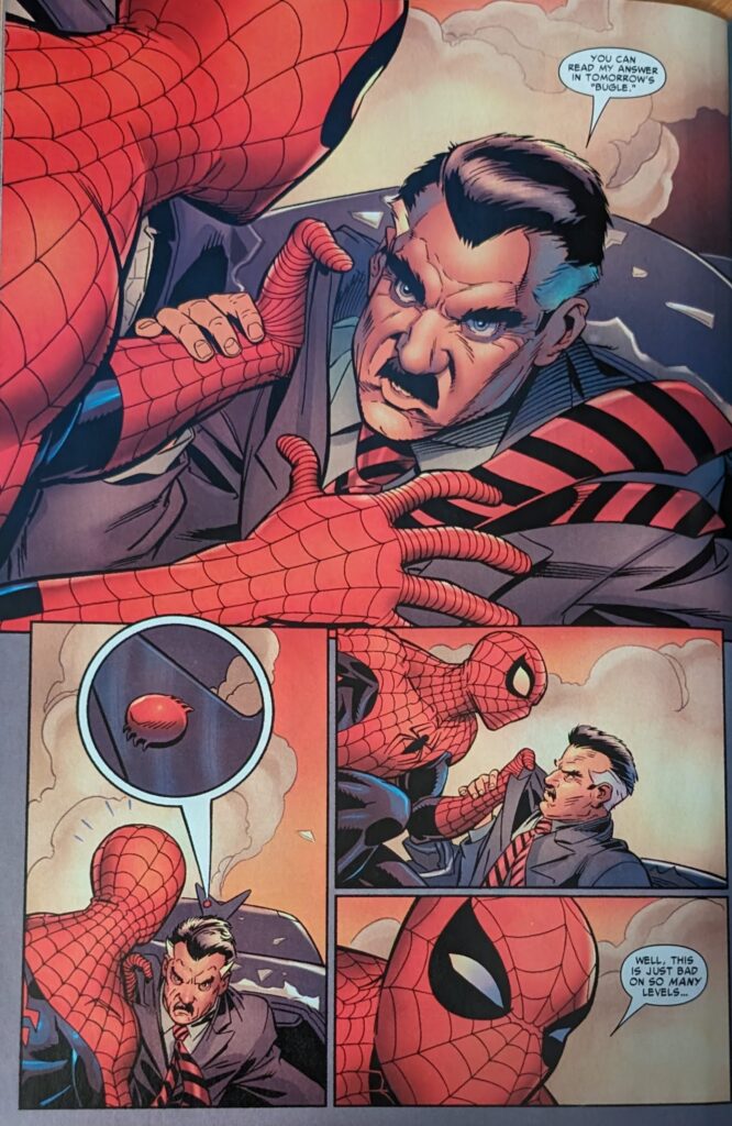 Why does Peter have a mullet? Did Ringo look at those hideous MKSMs and think that was the current model? Or did he just pick up where he left off in 1998? Well, Peter says he got a spider tracer on, uh, Tracer, and insists that he has to go get this guy to overcome his fear. MJ is not thrilled, but then he’s off. And eventually, he picks up the tracer in a limo, and then he… sets up his camera? Is that “summer job” at the Bugle still happening? I am so confused.