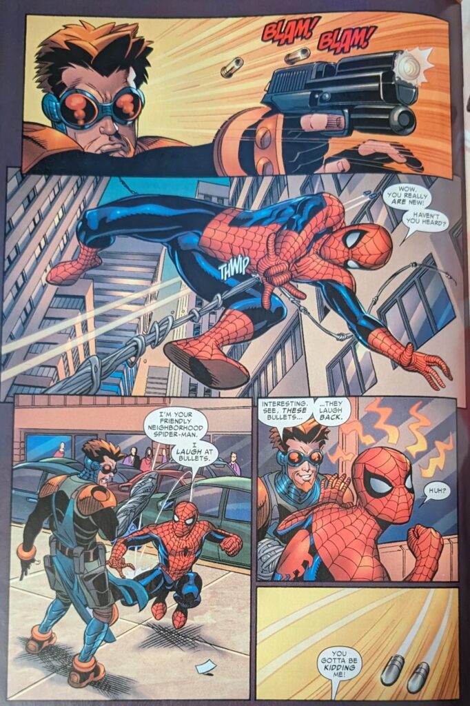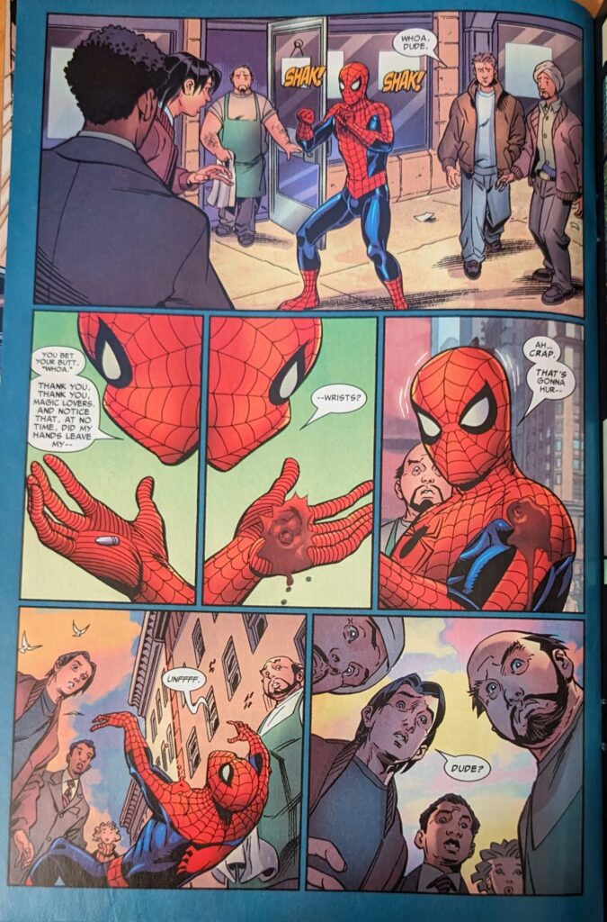 Well. There’s something you wouldn’t see in comics last time Peter David was writing Peter Parker. That’s one way to get the exposition out of the way. Next day, some dork is robbing a bank, and Spider-Man appears on the scene. The dork leaves the teller to keep packing his money, assuming he will make short work of Spider-Man outside, who tells him he’s got “new bad guy smell.”