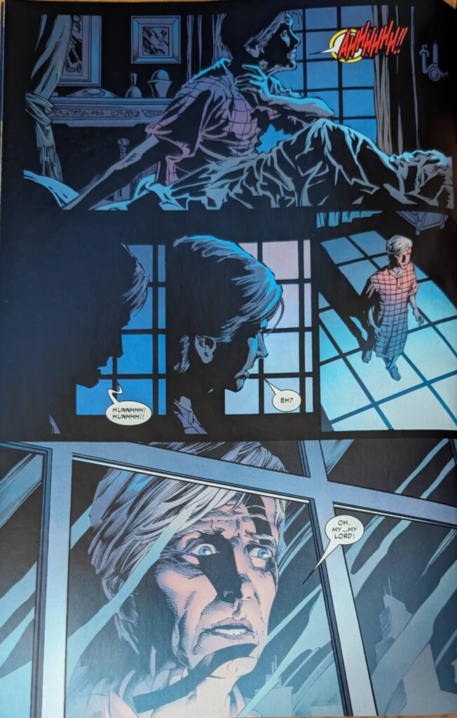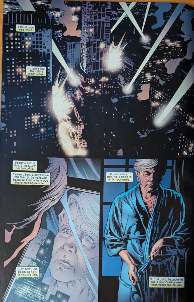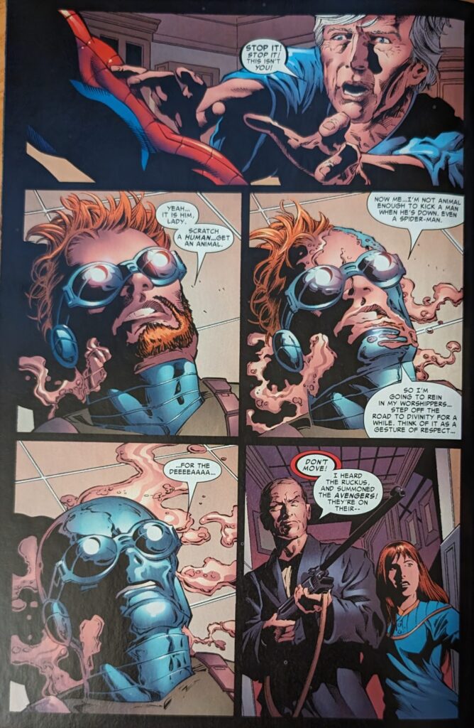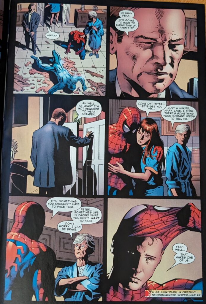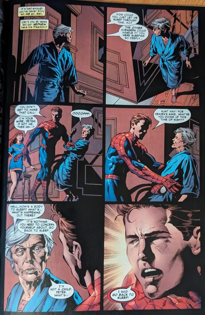 Guys, we’re having fun. May, to her credit, just asks him what’s wrong, knowing immediately it’s not about whatever’s going on, and he tells her to trust him and go to sleep. MJ shrugs at her, and May continues to the kitchen, telling the Ben in her head she does trust Peter, despite him lying to her all these years. Jarvis is not in the kitchen, and that reminds her to tell the Ben in her head about him. She begins talking out loud, saying she really likes him, and there’s been no one since Ben. NO ONE SINCE BEN. JUSTICE FOR NATHAN LUBENSKY!!!! Jeeeeeez, man, I liked that guy a lot, and he gets no respect! Willie Lumpkin, ok, that didn’t ever seem serious (Did that ever officially end, or is it one of those things that just disappeared due to clone crap? I can’t remember). But Nathan! Put some respect on his name!! She says there’s been no one since Ben unless you count Otto Octavius, and she doesn’t know what she was thinking. Nathan was her man the last time PETER DAVID was writing Spider-Man! JUSTICE FOR NATHAN! Well, anyway, someone catches May in her borderline worrisome outloud chat with the Force ghost of a young Ben Parker, and given the topic, you might expect it to be Jarvis, so something cute can happen, but…