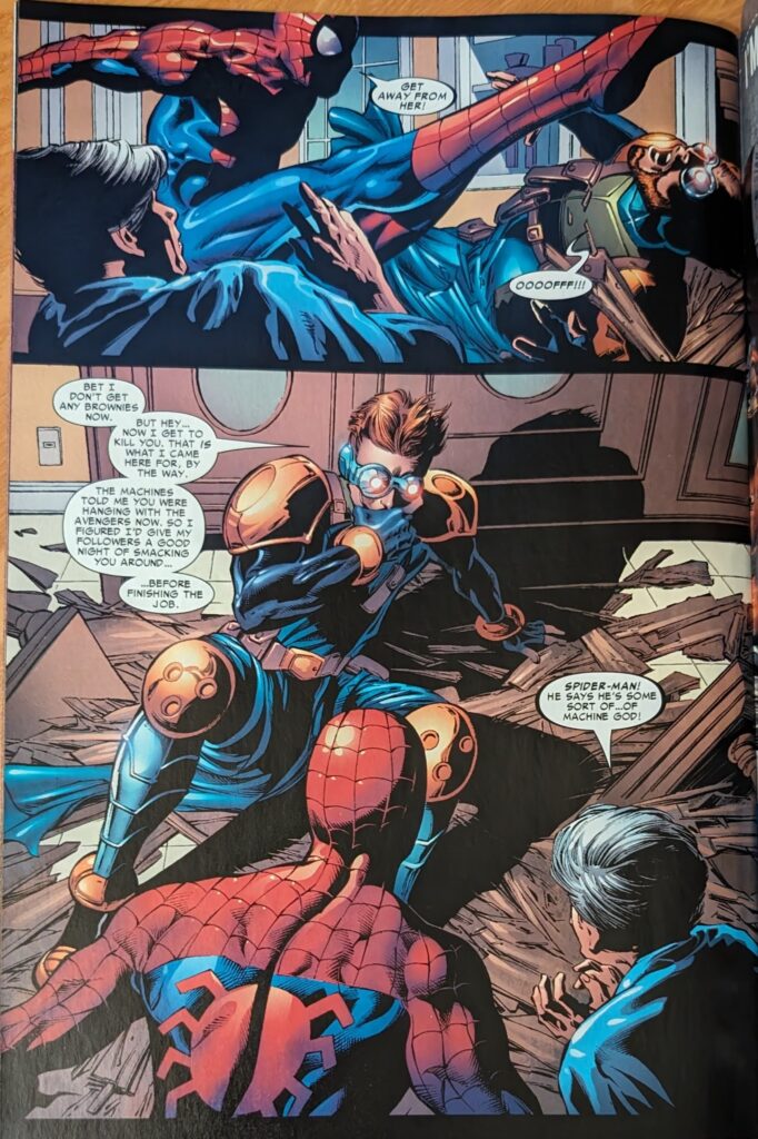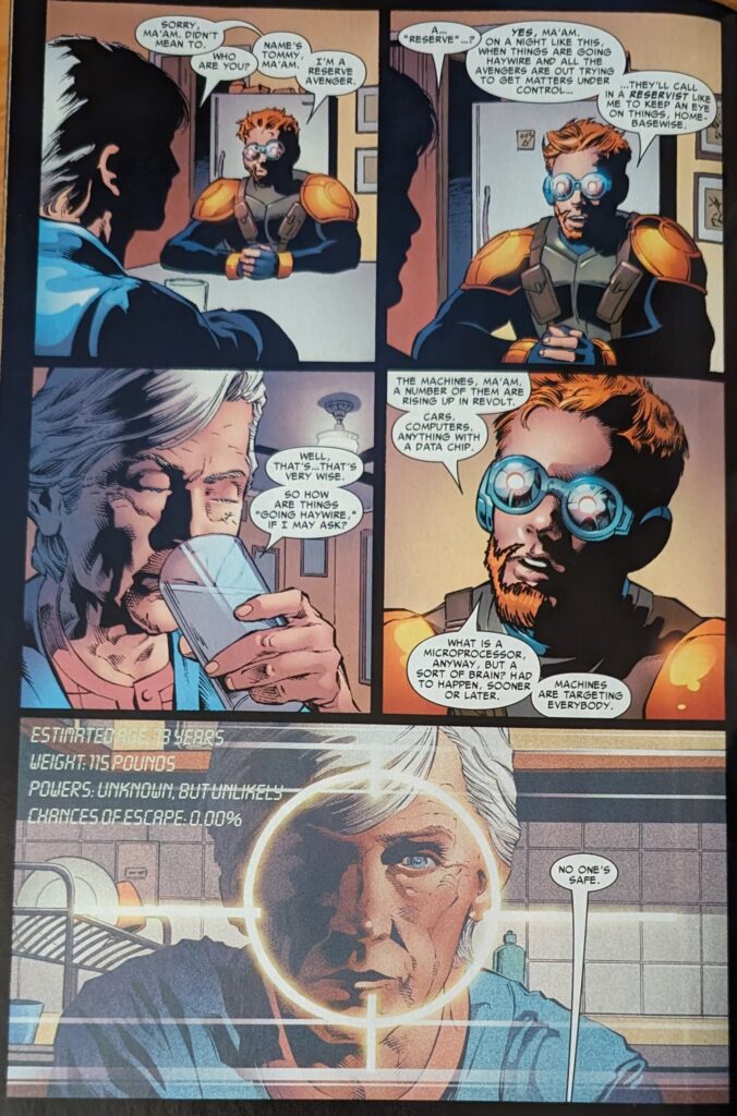 That is a really bad voice for Wolverine, wow. Back at Avengers Tower, Tommy Tracer is explaining to May that he’s the God of Machines as she makes him a sandwich. She believes this about as much as anyone would, but he keeps on yammering about them praying to him and such, then wants to talk to her about disconnecting her mom from life support, saying he heard her yelling about that in her room earlier. Which makes zero sense, but this is the Other, nothing is making sense and it’s gonna stay that way.