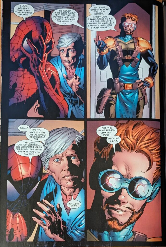 I’m tired of this dork. Also, his beard looks hastily and poorly slapped on after the fact in every panel. I suppose it could be a symptom of Deodato tracing some clean shaven celeb, but it looks more like he didn’t know this guy has a beard. Suddenly, on the next page, there is a transition so jarring it feels like pages are missing. Spider-Man is being thrown into a fire escape, then falling to the ground in a heap in an alleyway. And this was done to him by…