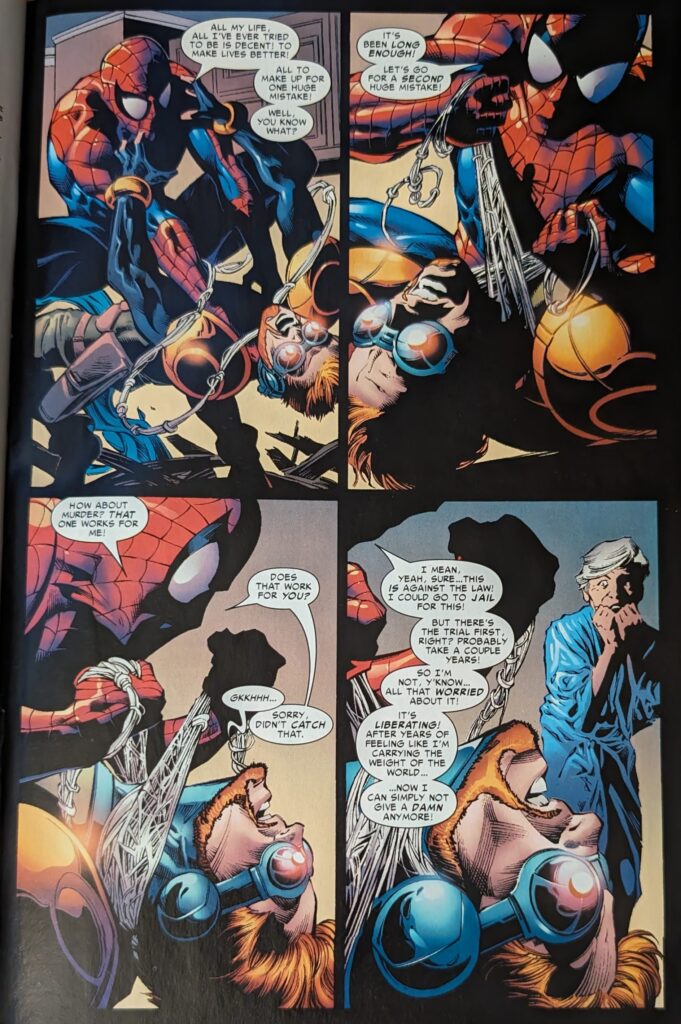 Everything Spider-Man is describing presumably happened last issue, but since we frustratingly kept 98% of that relegated to partially seen and described events on a TV in the background, we don’t really know what’s going on. I mean, this is pretty inept. Peter David is a long term pro. Things get even sillier as Spidey lunges at doofus here, and he… snakes some tendrils out of his fingertips into Spider-Man’s side and then learns his diagnosis. This guy’s powers are absurd. He gets offended that someone in Spider-Man’s condition is even fighting him. Spidey snaps. Very Peter David Spider-Man of him. Shades of the Death of Jean DeWolff…