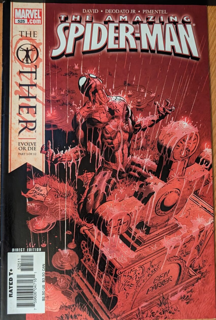 If I was a writer, and I got to see my words first rendered beautifully by Mike Weiringo, then immediately turned to crap by “Pat Lee,” or whoever it was, and then turned to squiggly mush by Mike Deodato… I might quit comics. Whiplash. Look, guys, Peter’s upset Uncle Ben is dead! We’re really breaking new ground here. At least the red color feels more appropriate to this drawing. It’s the usual ASM art gang for Mike Deodato, Jr., Joe Pimentel and Matt Milla, and we begin with a really cheery flashback to young Aunt May & Uncle Ben dealing with the decision to take May’s mother off life support. Then her mother wakes up and starts strangling her, offended that she’s afraid of death, demanding that she fight. I mean, that’s weird.