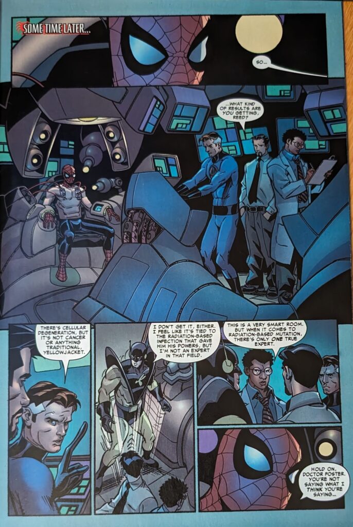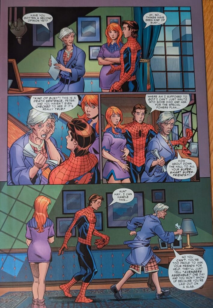 Plus: More Weiringo art. Con: 3 consecutive issues by Hudlin. Let’s get on with it. We begin on a splash of Aunt May reading Peter’s diagnosis.