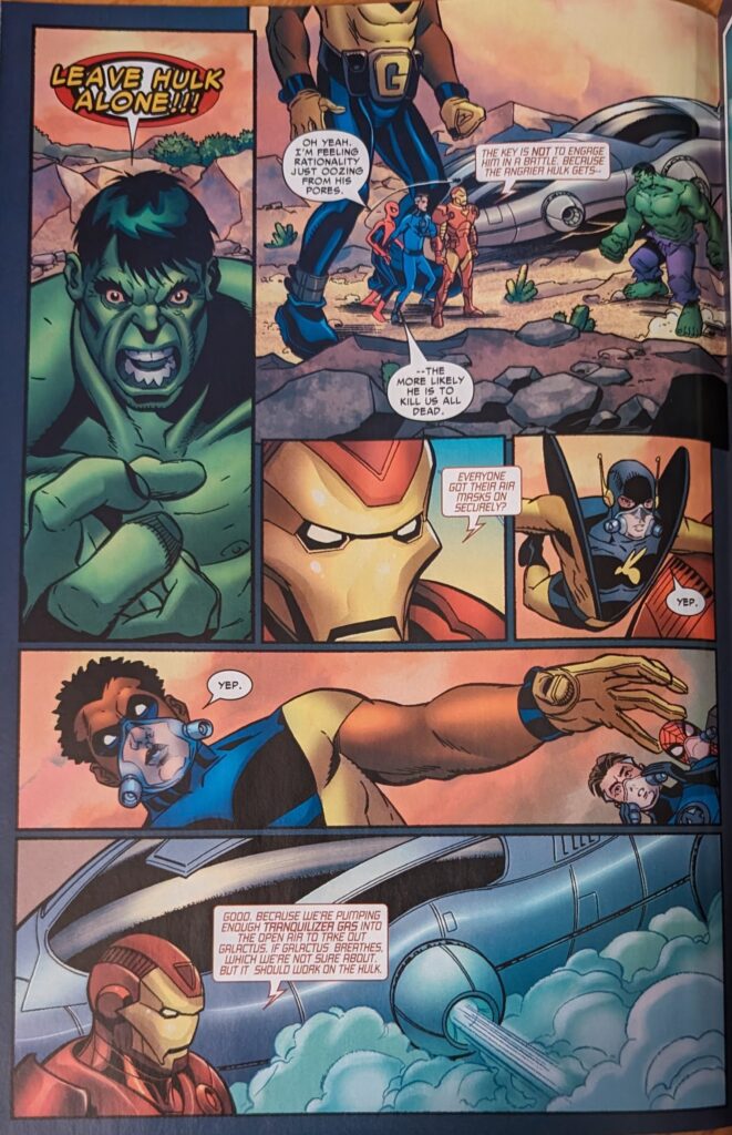 Reed Richards, Tony Stark, Hank Pym and even Bill Foster, they’ve really called in the big brains. I would expect T’Challa to be there, especially in the time before his scientific acumen was transferred to Shuri because everything in comics has to follow the movies, and he’s on the cover, even, so maybe we’ll reach him eventually. Well, the science team and Spider-Man have flown to the desert to find Bruce Banner, but of course, they find the Hulk. It must be said that Ringo executes the Granov Iron Man armor perfectly.