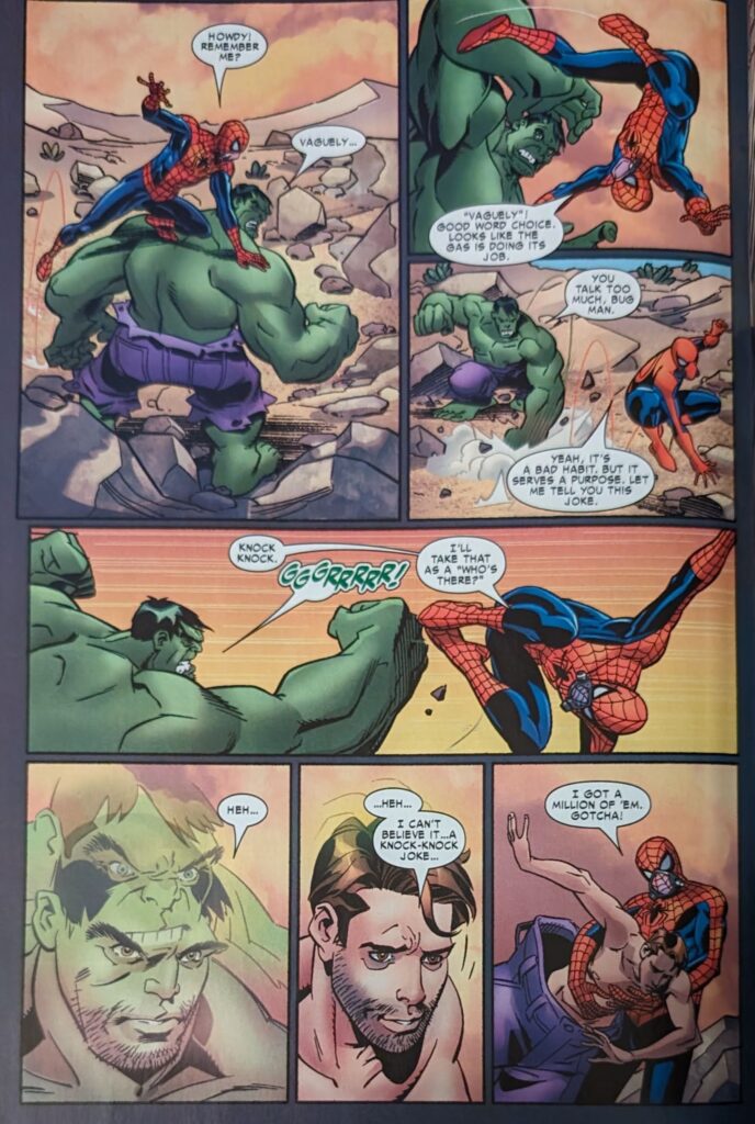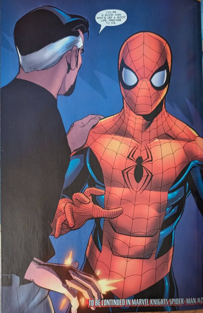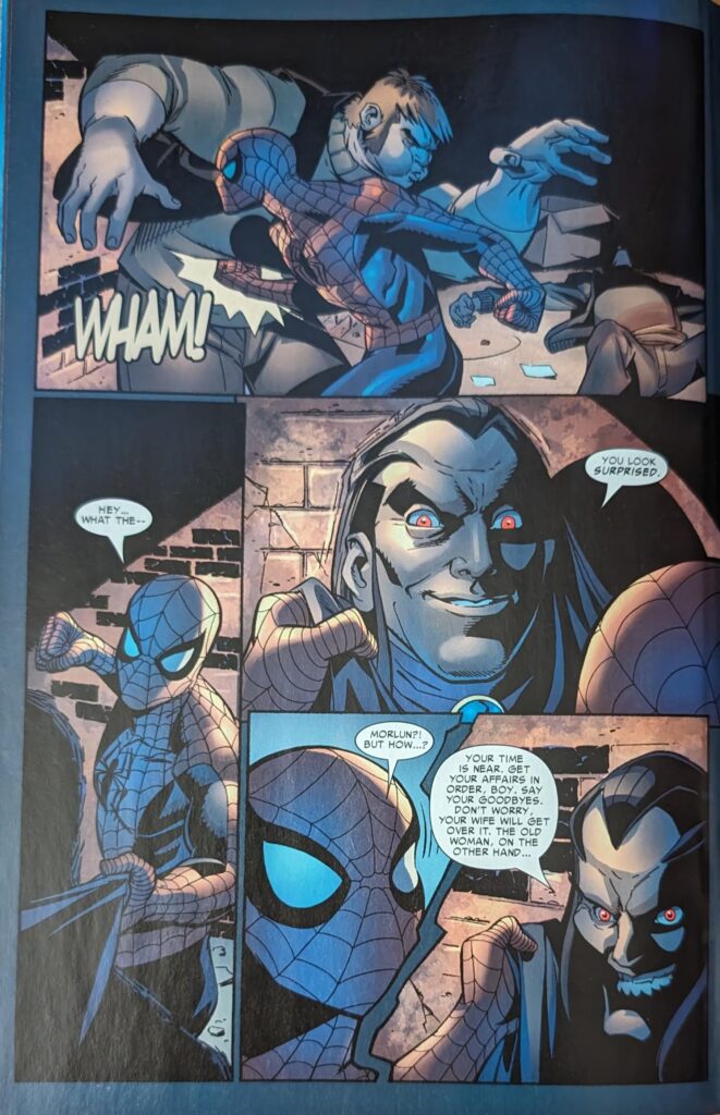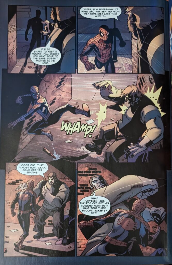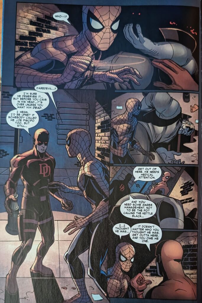 Spider-Man proceeds to beat “Morlun” near to death, but of course it’s just Ox, and lucky for him, Daredevil appears outta nowhere and stops him.