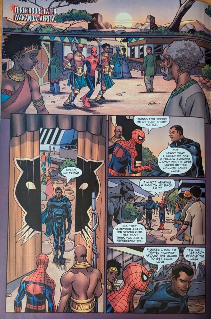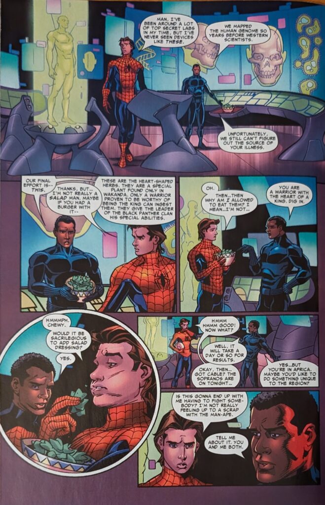 Hudlin, of course, is the writer of Black Panther in this moment, and I’d say you’d be hard pressed to find a better example of why that was a mistake than T’Challa casually giving Spider-Man the jealously guarded ancient source of the king of Wakanda’s powers. Boy oh boy. T’Challa takes Spider-Man to the Temple of Anansi, which looks a whole lot like the temple Ezekiel got his powers in. Spider-Man points out that the last time he was in one of these, someone tried to use him as a human sacrifice, and… and T’Challa says, “You’re right. It could happen here, too. Let’s head back.” Th… then why BRING him here!?!? So much of this issue feels like filling space. So much of this STORY feels like filling space, the first 3 issues could’ve easily just been one. Real Maximum Carnage vibes. As the heroes leave, Morlun watches them go from the shadows, because he’s everywhere, all the time.