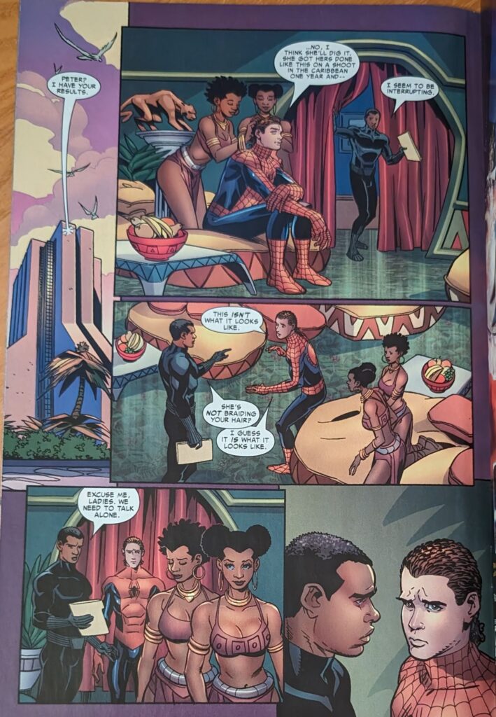 Nice of May to be the voice of reason. Next up, we find Luke Cage and Spider-Woman outside Tony Stark’s office, into which, Jessica says, “that redhead chick and that old lady” entered an hour ago. Luke says this must be because there’s some truth to the rumors about MJ and Tony, and then May & MJ come out, Tony saying he’ll take care of this, them asking it be kept secret. Now Jessica believes Luke. Whatever.