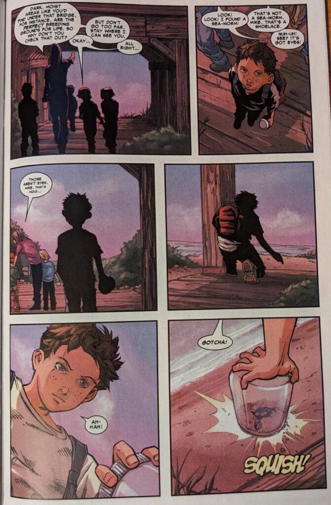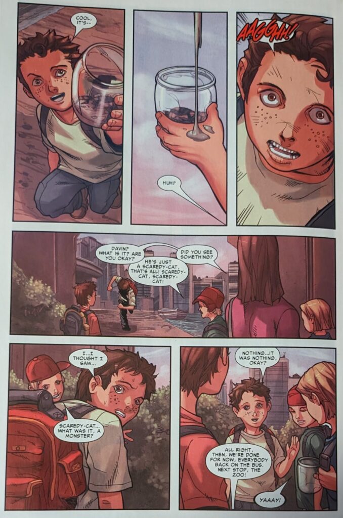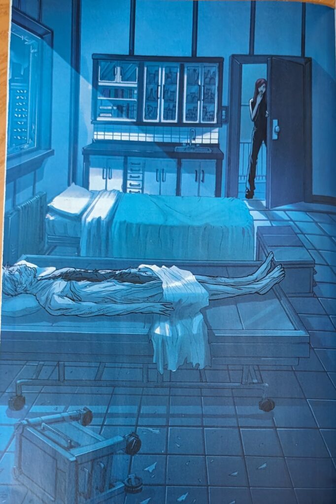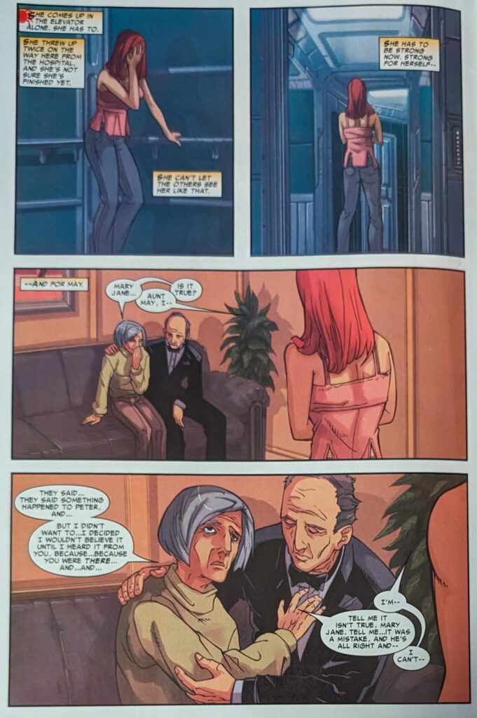 More than half of this issue was spent watching people mourn someone who wasn’t dead. Who no one reading this comic believed was dead. Is that worth cover price? I say thee nay. Especially not with this art. MJ is shooed out of the room, and even though what’s left of Peter is visibly just skin, even in the hands of “Pat Lee,” it takes Tony and Steve 2 pages to begin to realize that what they’re looking at isn’t someone having broken in to desecrate his body. Steve finally realizes the glass is broken outward, not inward. Tony begins to ponder what’s going on, as a voice over says “There’s a lot of things people don’t know about spiders…”