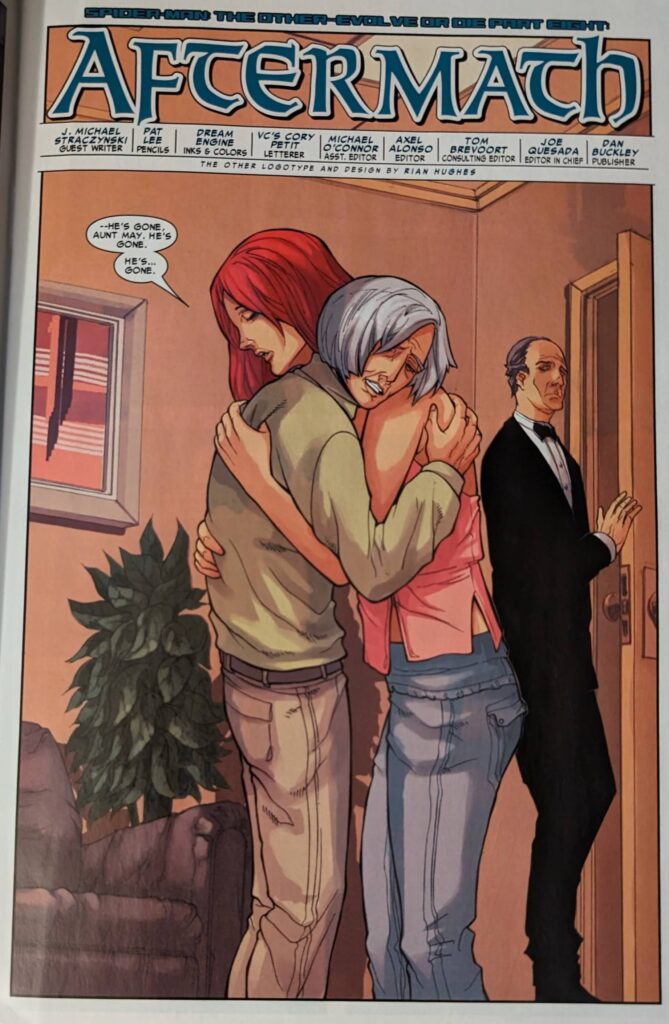 Oh sure, a cocoon. That makes sense. Spiders are known throughout the world for their cocoons. Well, this issue begins with the catastrophic decision to have whoever’s work is being signed “Pat Lee” this month draw Mary Jane informing Aunt May her son is dead.