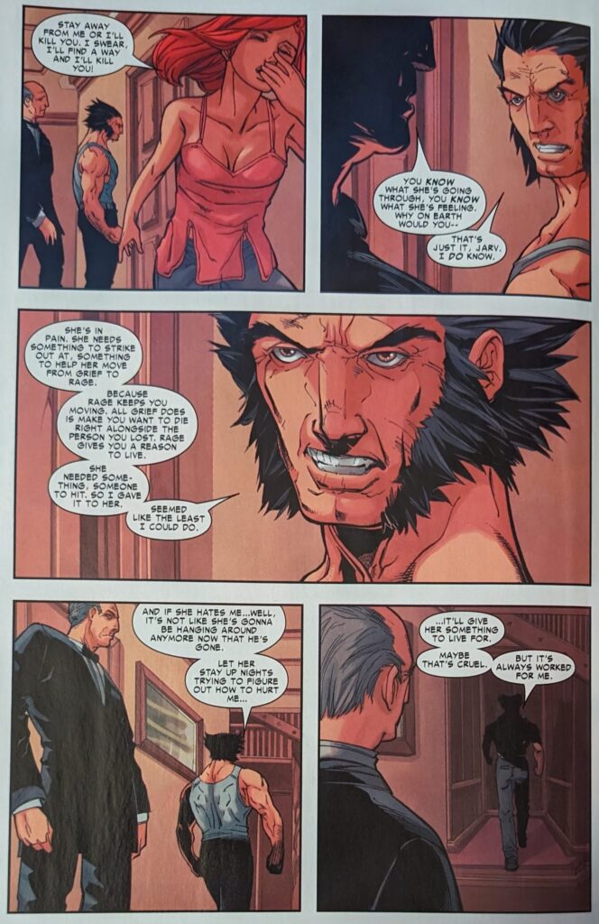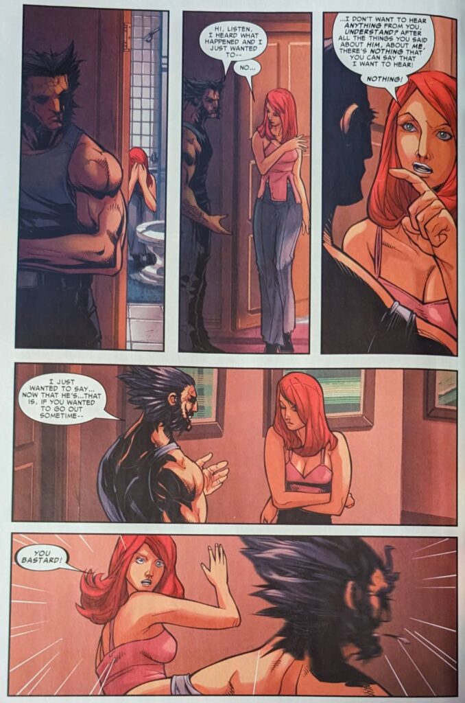 JMS’s Wolverine is really baffling. MJ returns to Stark, having decided she wants to cook up a story where some dudes attacked her and Peter on the street, and he died defending her from them, so everyone will know he was a hero. Tony says they’ll set it up, and then MJ goes to see May, who is with Steve. Then we jump ahead to MJ on a balcony looking out over the city when Jessica Drew comes to talk to her truly improbably drawn self.