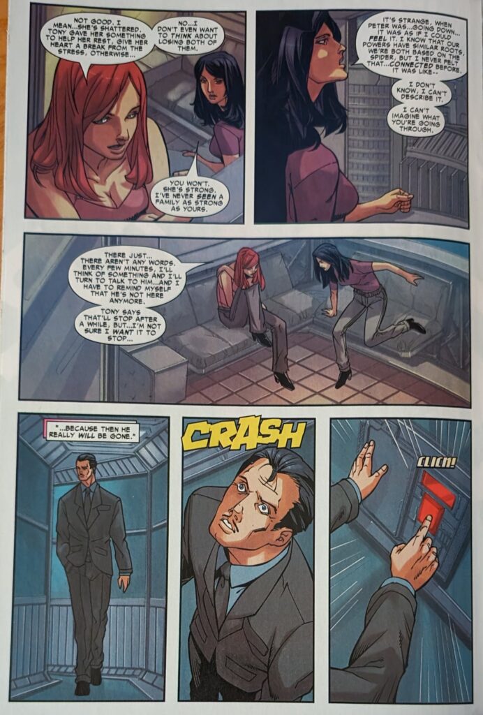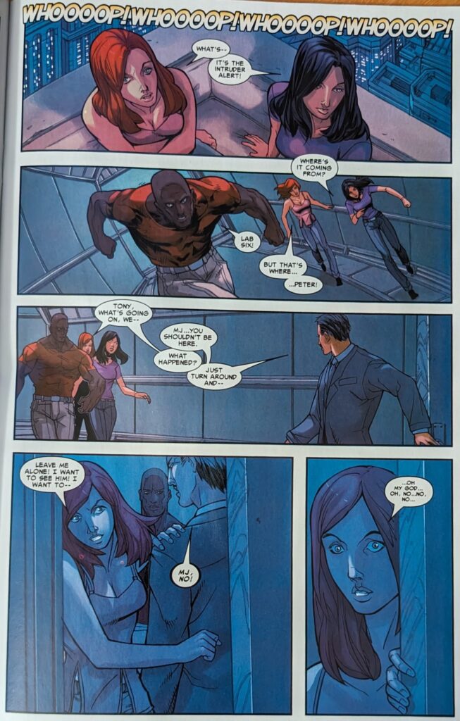 There were high school kids doodling in their notebooks drawing better than this. Look how long Jarvis is!!! After another page of ineptly rendered grieving, MJ has to go talk to the Avengers about what to do. First, Steve Rogers offers to go talk to May. Then, Tony Stark lays out that they have to decide what to do about Peter’s secret now that he’s dead. Dead! Died in part 7 of a 12 part story, you know it’s real! Why even do this? Why pretend? I mean the least they coulda done was end a storyline on his death, like a cliffhanger, try to give it some weight. Who thought he was really dead in part 7 of a 12 part story? I begin to think the impending 2006 crossover event forced this story into hurry up mode. I would hypothesize that JMS might’ve done all this himself, in a way that made more sense, in ASM, but knowing what was coming meant he didn’t have a year to mess with it. Or not, I could be totally off base. Well, anyway, Tony explains all the gruesome options for covering up Peter’s death, and MJ is overcome, runs out of the room and cries in the bathroom. Then there’s this…