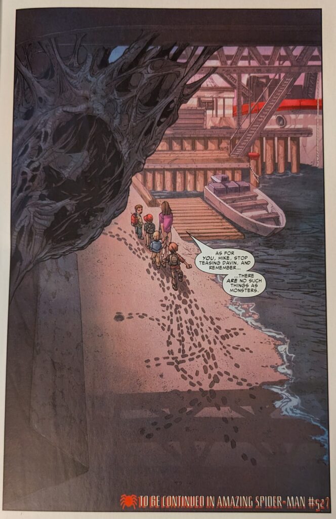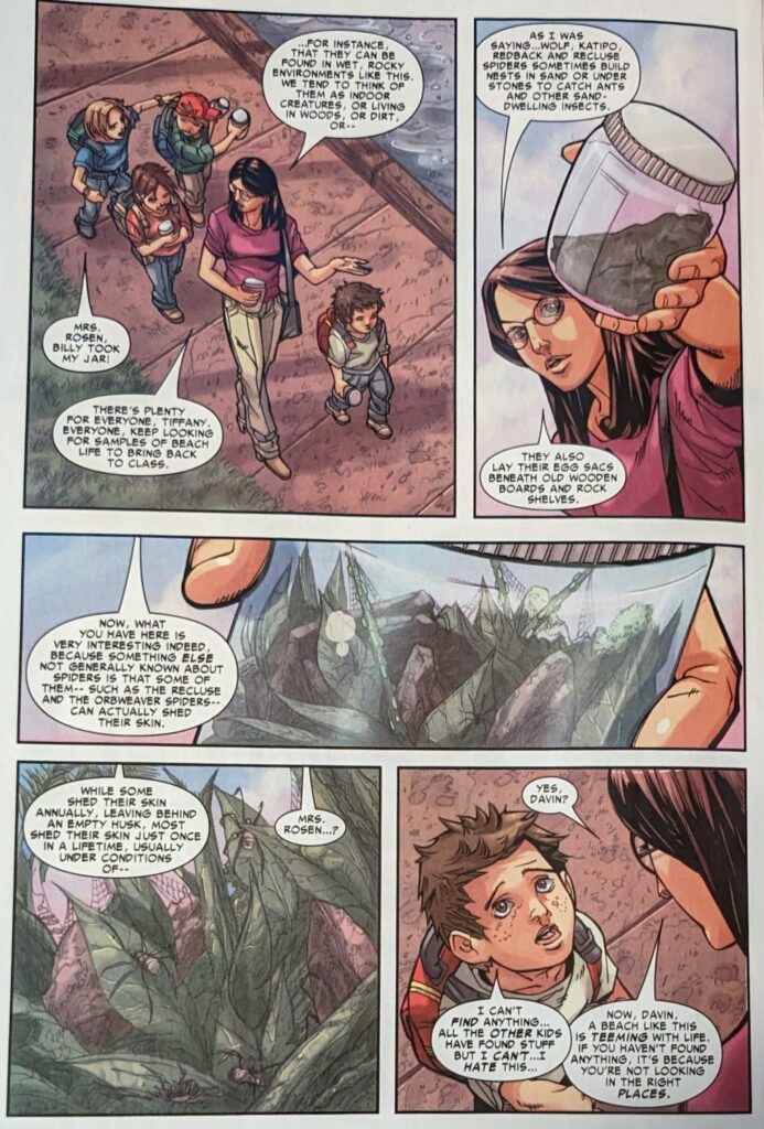 Straczynski scrambling to cover this cocoon nonsense with spider facts. “They shed their skin, see?” Yeah? Do they do that and then travel a great distance to make a cocoon? No? Then who cares? What a farce this is. And they have the nerve to be like “Who… or what… will emerge?” in the next issue teaser. Oh, I don’t know, I’m guessing Peter Parker, back to normal. Ugh. How do we go 3 more issues after this? He’ll be back next issue, the end. Morlun got turned to dust. This story is so bad…