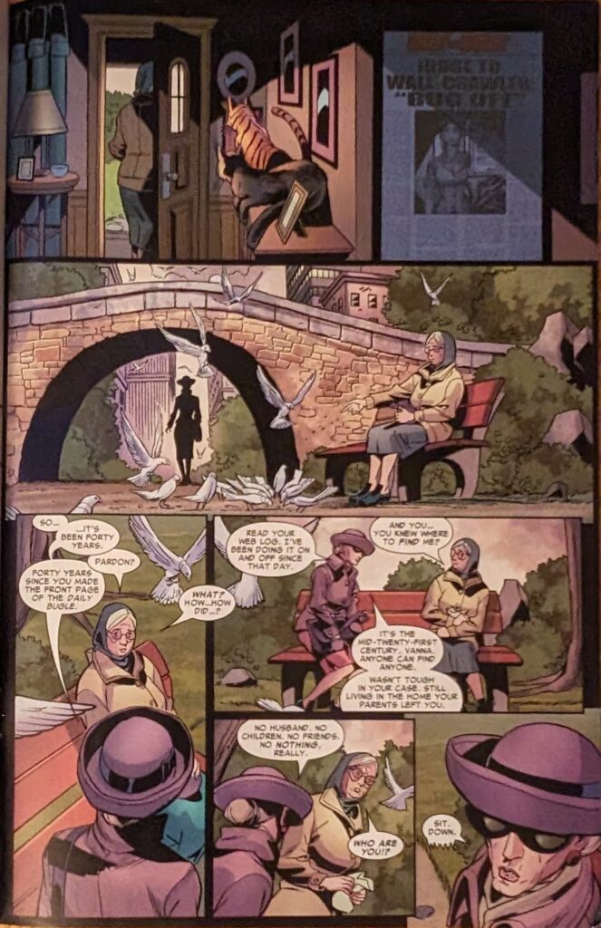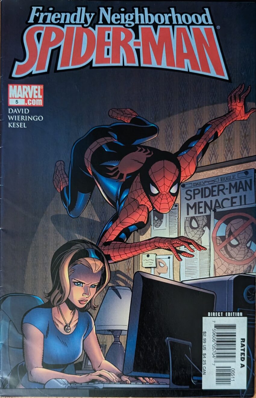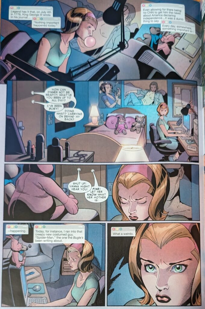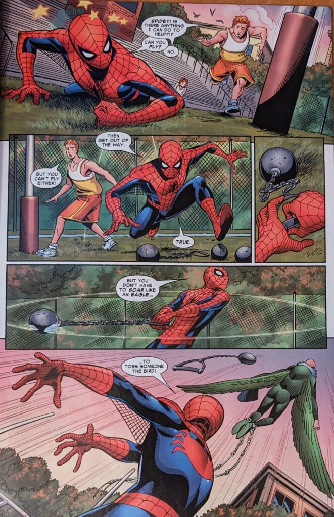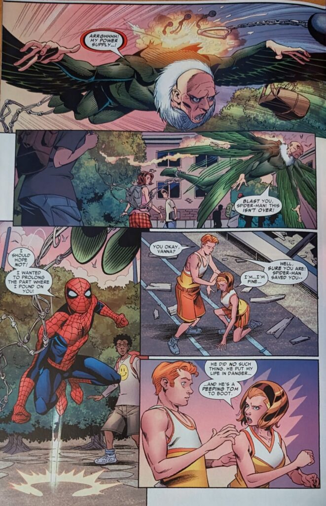 Why is this a flashback?? You finally get your book back and you go back in time?? This girl had a BLOG when Peter Parker was a teenager in 2006??? No matter how insane editorial may become, there is no way Peter Parker is younger than 23. I think older, myself, but we’re very much into the era where they’ve decided married, father-of-dead-child, has gone to grad school 5 times Peter Parker must “represent youth.” So as this comes out, he was 15 in 1998, at the absolute earliest. And this girl’s blogging??? She can’t even be Livejournaling! She’s on AOL chat rooms! Peter David, I say thee nay. Hm, working that out has made me realize in 2006, Peter is either at or near the time he becomes younger than me. I never thought of it that way. I mean he’ll obviously be younger than me most of my life, but after 20-some odd years of Peter being older than me, in 2006, he must now be around my age, and getting younger every year. Huh. I go to so distracted by the anachronism I forgot what’s happening in the comic.Oh, so this Vanna was frozen in fear but tells her BLOG that she fearlessly stood her ground, and then Spider-Man appeared from under the bleachers, where he was probably spying on her, like a creep, because she does not like that guy.