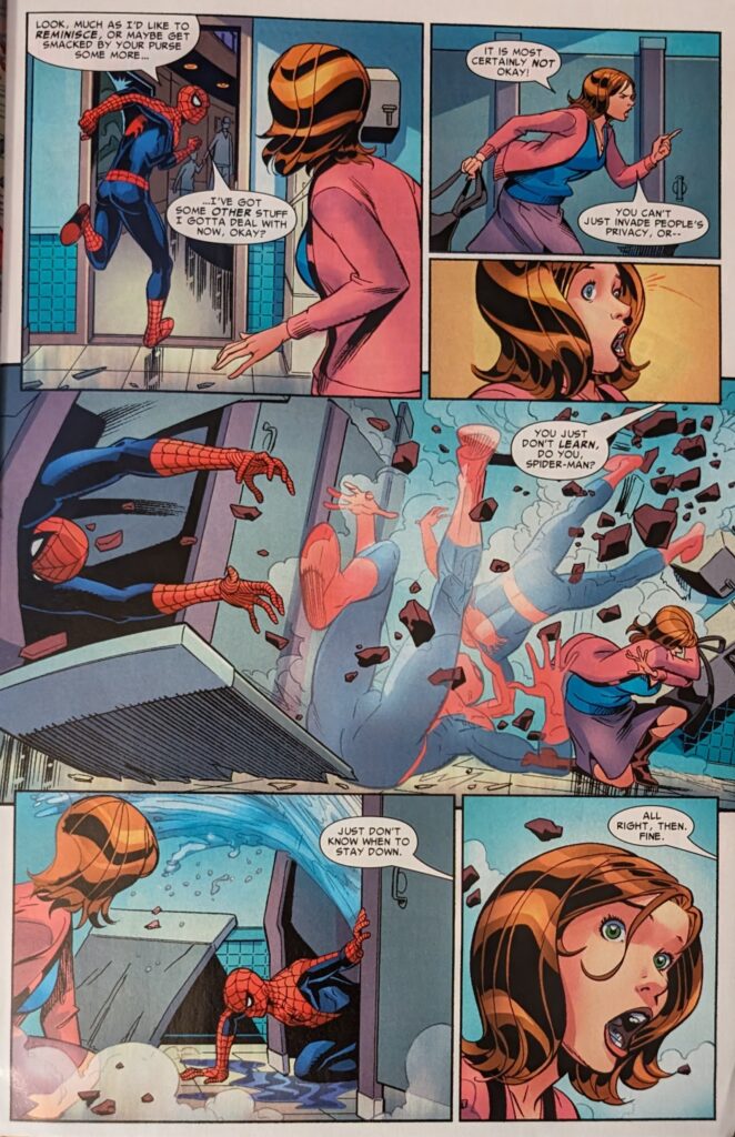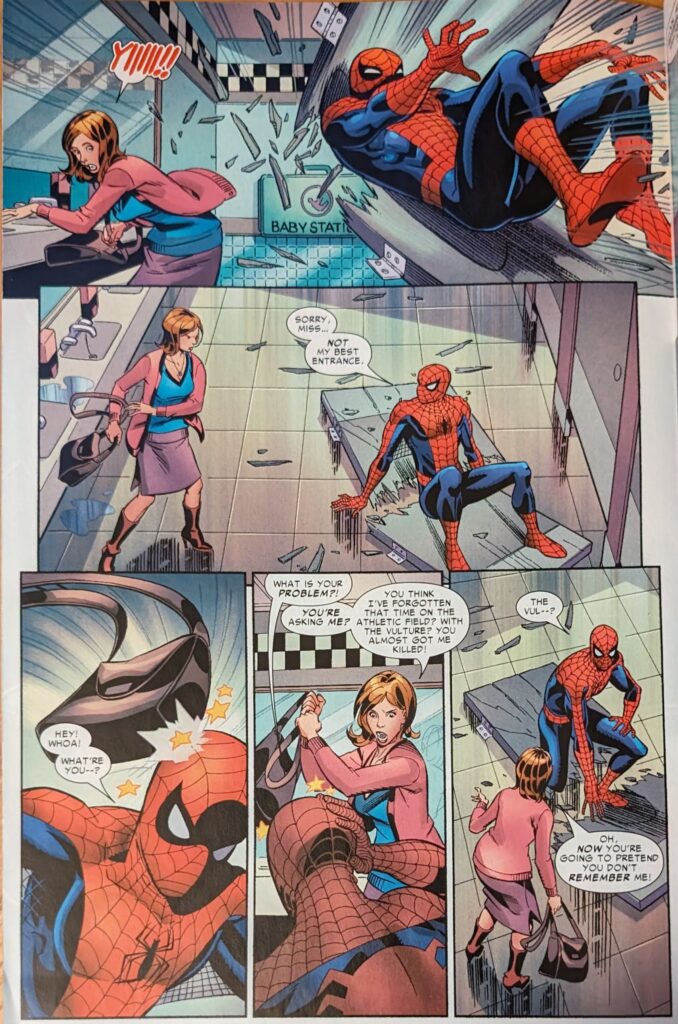 I wonder if this was for Ringo. A chance to do something more lighthearted after the dreck he just slogged through. I hope so. Now it’s “a few years later,” blog entry #583, this lady runs her blog like Punisher’s War Journal, and this entry is about how “Spider-Man took a long time to make his follow-up move.” She was at the NY Science Museum for a college assignment and went to the ladies’, and guess what?