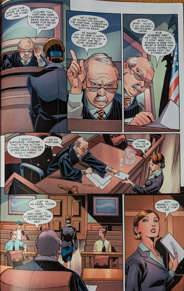 So then she went to the Bugle, where JJJ wanted to do a story on her. He made Peter take the pictures, of course. She asked Peter if they’d met, and he said she didn’t know him at all. I guess I should’ve dignified the “Peter Palmer” joke with a reference back to the original typo, but it was too cutesy. Anyway.
