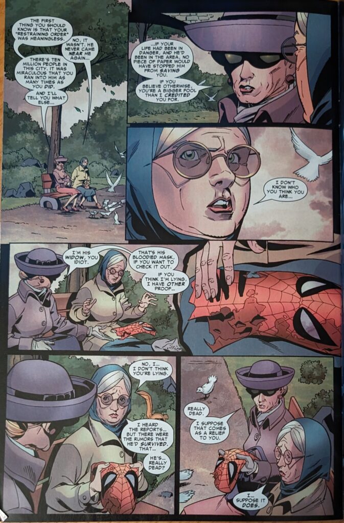 Does Ringo just love the Looter? He did all that Looter stuff with Todd DeZago, and now this. Spidey clobbered the Looter and said, “It’s been fun, Crazy Lady! We gotta do this again sometime!” on his way out. Not the right choice of words! Next it’s blog entry #1479, Spider-Man fought Sandman at a beach she was at, obviously to get her attention. She says her therapist was skeptical that he was stalking her. How bout that? Entry #1621, Spidey and Rhino fought through a coffee shop she was in. The cops don’t believe her and she’s dropped her therapist for also not believing her. She said she knew what to do.