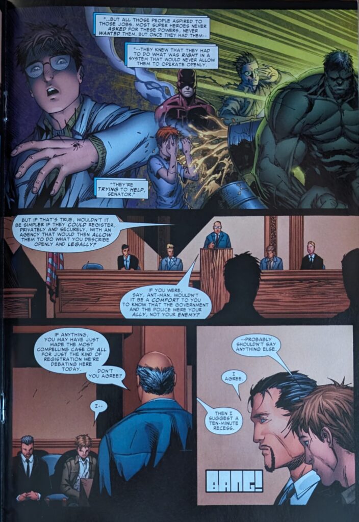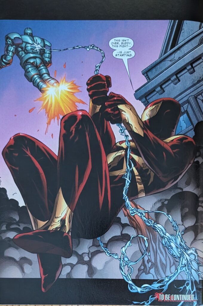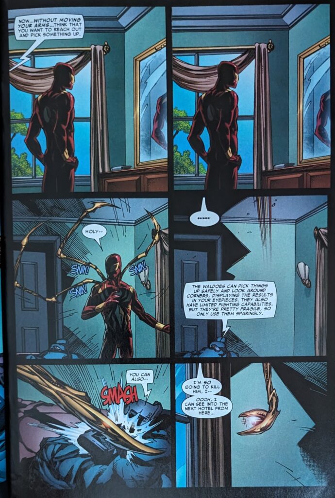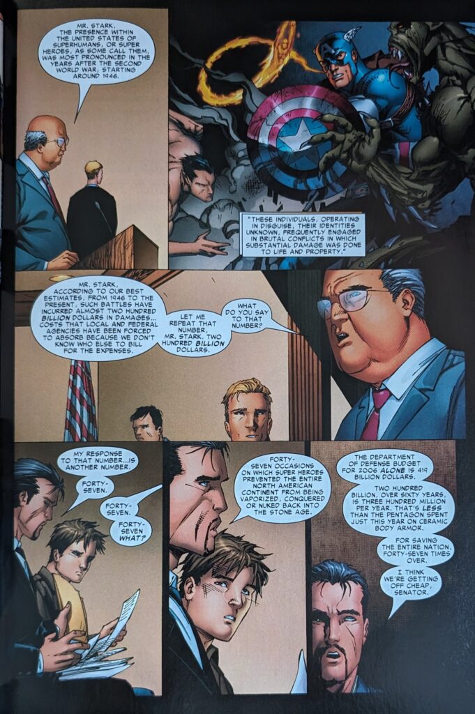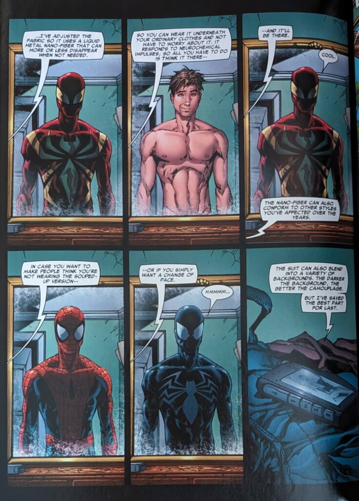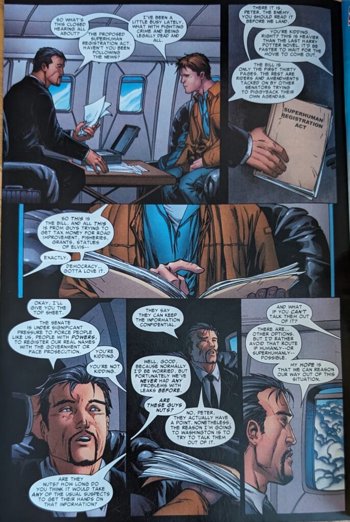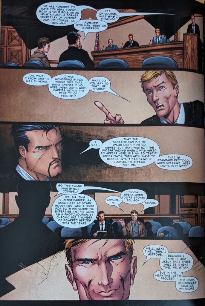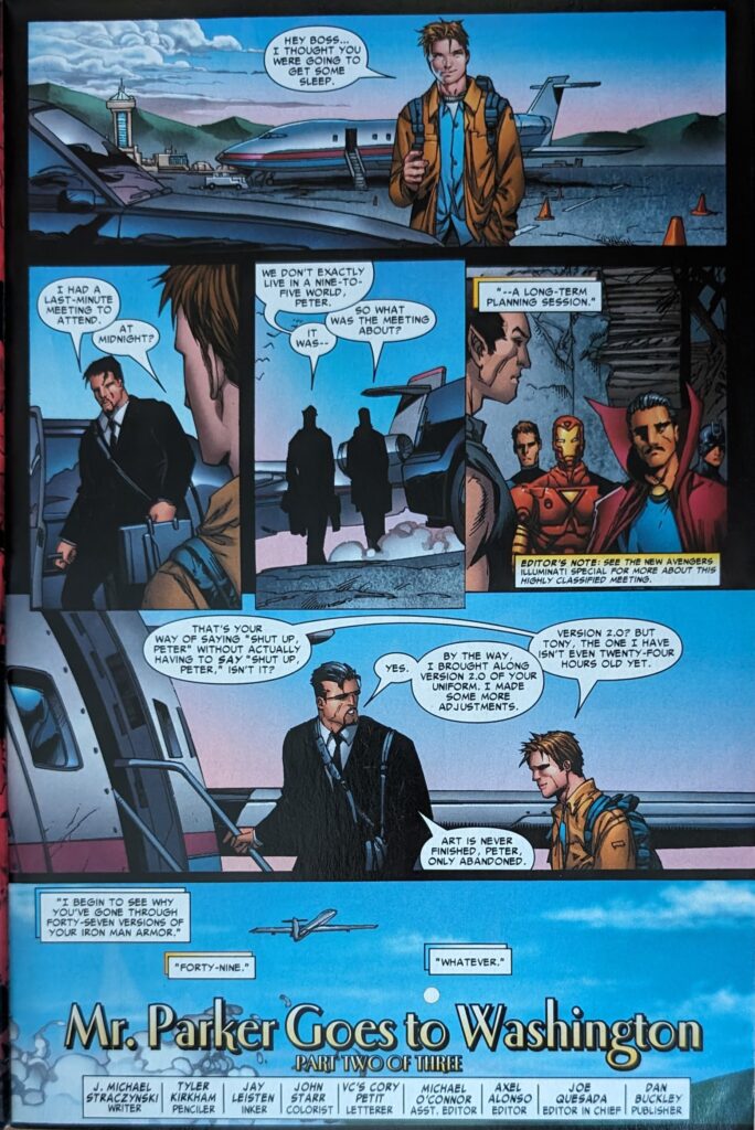 I wasn’t reading Iron Man at this time. I’d be curious to. What with him privately supporting and publicly condemning the Registration Act in 2 comics written by other people, I wonder what his actual minders were doing. Over a page of really dumb “comedy” of 2 editors’ notes arguing about registration, they arrive in Washington, and Peter checks out the new version of his suit.