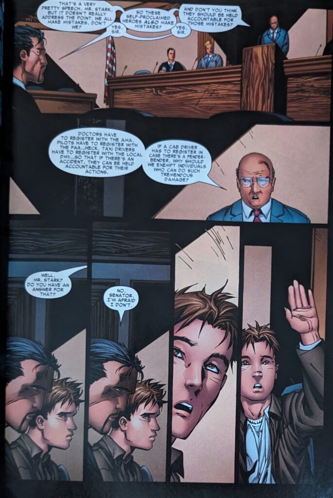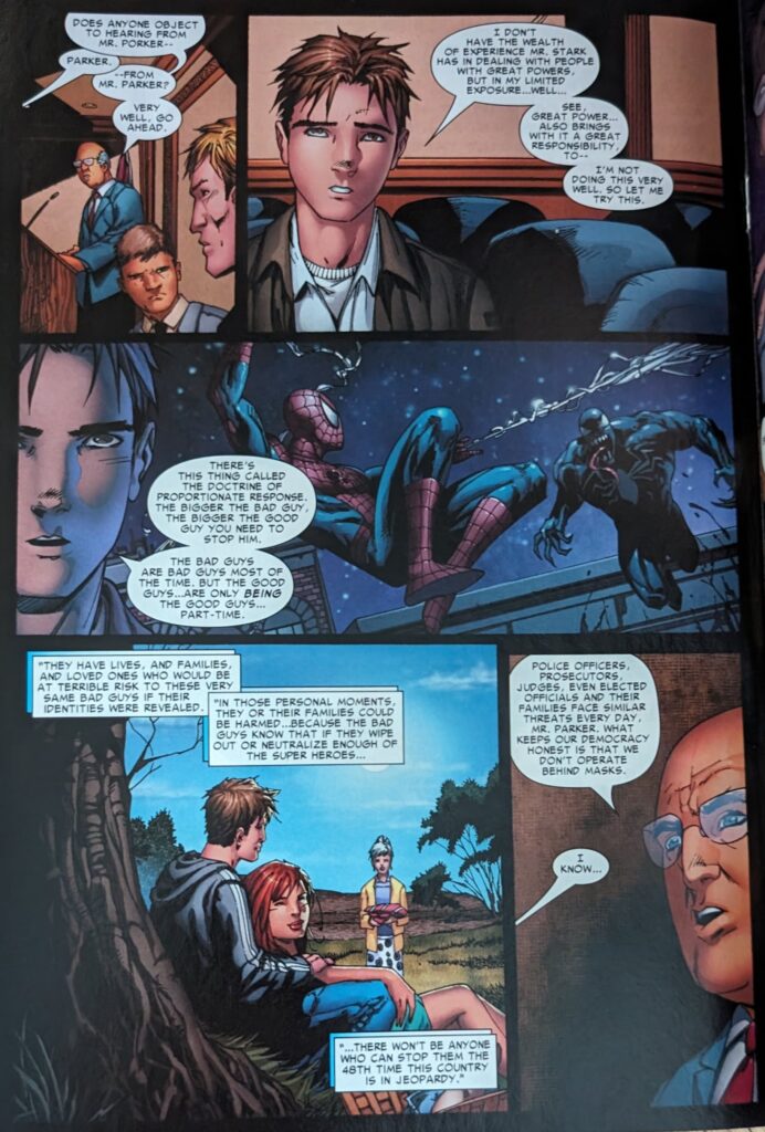 I think the Senator’s point on the page ruins the entire thing. He’s 100% right. 100%. Registration makes sense if you’re approaching the concept of super people from a real world perspective. No one should have to live next door to a Hulk without knowing it, and Hulk shouldn’t be able to just walk away when he destroys an entire town. In the world of the Marvel Universe, it’s the only rational choice. But in the real world, no one reading comics would actually want the heroes to be registered, it would break too many things. So you create a no-win situation from out of nowhere. They try to balance this, to give the anti-registration side some leverage, but tacking on the nonsense about literally anyone with powers being forced to become a solider or go to prison. That’s bonkers, that’s obviously bad. But that’s not registration, that’s what comes after. Registration is categorically a reasonable idea, and the entire, endless Civil War story is about trying to act like there’s 2 sides to the debate. Great stuff. JMS tries to have Peter give a response: