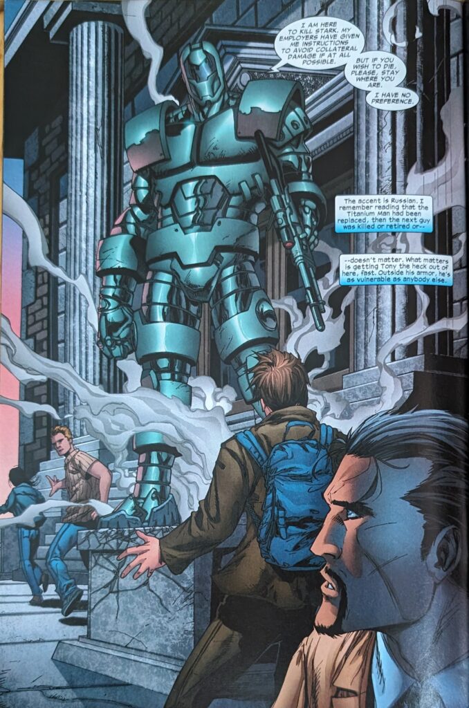These 2 guys pretending not to be superheroes talking about this is very funny, but obviously not meant to be. Tony tells Peter he gave them way too much to use against them, but also that he spoke truth to power, and that’s good of him. Then Peter calls MJ for some comfort and is targeted by power suit guy, but then they go back in for more. We jump ahead 4 hours, to Tony pointing out that prohibition only created organized crime, and if you make powered people criminals, you don’t know where that will lead, and then they’re out of there. As they head to the car, Peter saves Tony from getting shot. Tony recognizes power suit guy as his old foe, Titanium Man, but I sure didn’t.