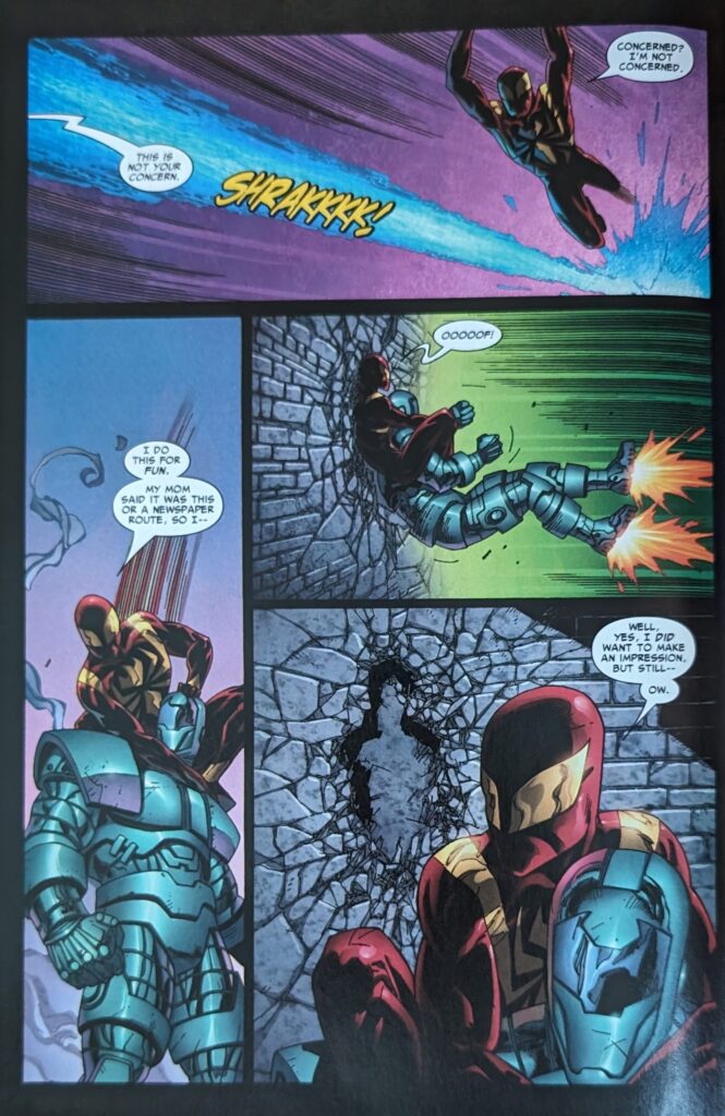 The suit has robot arms. 3 of them. Why not 4, for 8 limbs, like a spider? Joe Quesada said it was less predictable. It’s stupid, is what it is. The movies rightly changed it to 4, although the number I would prefer is zero. Makes him look like Doc Ock. And I won’t be the last person to notice that. As Tony & Peter head to the Senate, we see a guy in a very 90s power suit failing to get a bead on Tony and shoot him.