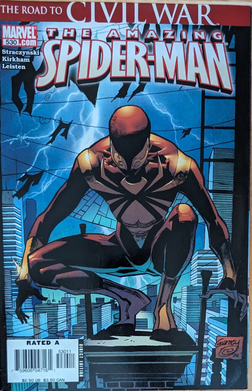 I skipped these issues when they came out, largely because I’d already dropped ASM and I didn’t like that new suit, but also, this is filler. Everyone knows the act is going to pass, the press for Civil War was endless. It starts in 2 months, anyone who buys comics knows it’s coming. And I have to listen to this debate? A lot of filler in the Spider-Man world lately. And more to come. But as long as we’re here…