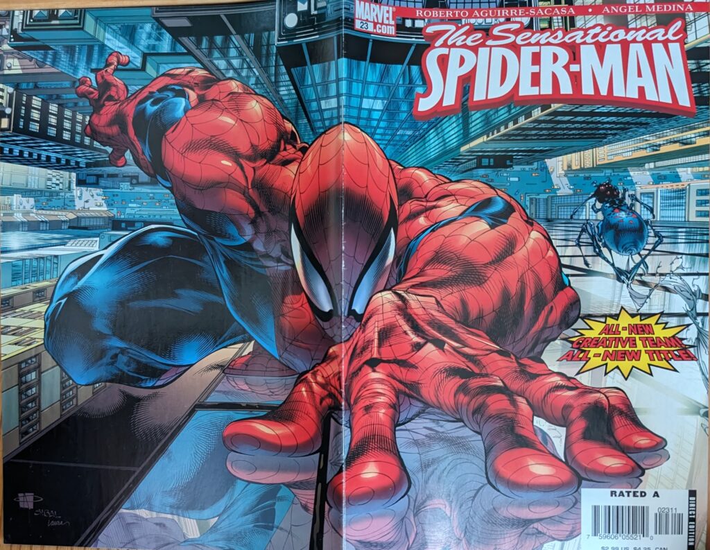 This month, Marvel Knights Spider-Man is suddenly Sensational Spider-Man. With the same numbering. 21st Century Marvel missing the opportunity for a new #1 is very surprising. Sensational Spider-Man starting at #23 seems much weirder. But I suppose I know why they did it. With a new name comes a new creative team. Roberto Aguirre-Sacasa signs on as writer. How he got pretty high profile Marvel gigs at this time is a bit of a mystery to me. He was sold to the readers as a famous playwright, one of Bill Jemas’ last “anyone from a more respectable field” hires before he himself was fired. His first Marvel gig was Marvel Knights 4, the FF concept Jemas tried to force on Mark Waid and Mike Wieringo that led to the PR disaster of them being fired and rehired. After that, Jemas’ silly pet project became a separate title. But from what I’ve read, Aguirre-Sacasa was only just starting out in the theatre at the time, having had just 2 works produced. Not exactly hiring “TV’s Alan Heinberg.” But his first play was about Archie of Archie comics, and got hit with a cease & desist, and that probably got him on Marvel’s radar. He’s actually gone on to develop the Riverdale TV show and even be CCO of Archie Comics, he must be a huge fan. As he takes over this book, he’s still writing that 4 book, as well as a disastrously wrong-headed Nightcrawler series with a horror bent. I bought that series and didn’t enjoy it at all. I’m very nervous about this. Joining him is Angel Medina, last seen around these parts unfortunately being made to draw cyberspace nonsense in ASM 406. Since then, tho, he’s done work for Todd McFarlane, where he illustrated many issues of Spawn spinoff Sam & Twitch for a young writer called Brian Michael Bendis. How ‘bout that? Like seemingly everyone who did work for Todd McFarlane up to that point, he absorbed some of McFarlane’s rendering style. His already very cartoony art was a good fit with McFarlane’s, but he took it even further. He’s inked by Scott Hanna and colored by “Avalon’s Dan Kemp.” As with Matt Milla, I’m left to wonder if Kemp was owned by Avalon the whole time, or was recently acquired. Good or bad, Aguirre-Sacasa is going to see this title out, and Medina is on for over a year, so here’s hoping it’s good. I never read it before. I was, in fact, reading no Spider-Man but USM in this moment. Not only did the Other convince me to drop ASM, the next thing in ASM convinced me to keep it that way. For 3 more months, anyway. So all 3 mainline titles are new to me until cover date July 2006. 7 months not reading any of the main Spider-Man titles was a previously unthinkable record for me in 2006… I sat through Maximum Carnage and the clone era, hating every minute and buying them, anyway. This was a new, mature me, who didn’t keep buying a product he wasn’t interested in. And now look at me. Owning them anyway. What a fool. Well, anyway. Let’s see what the Spider-Man comics of an Archie lovin’ playwright are like. Oh, right, this issue’s rather unusual cover layout is due to it being a wraparound.