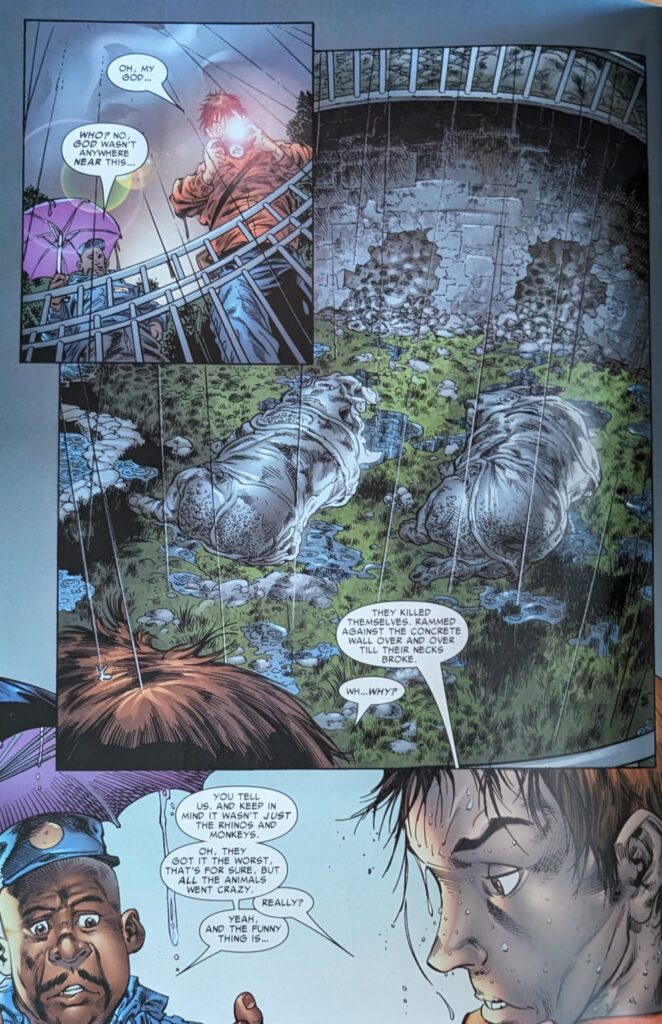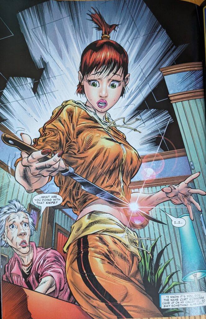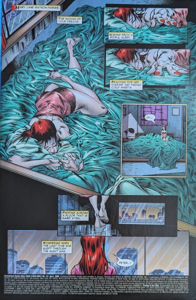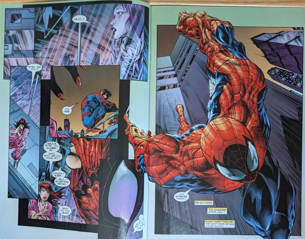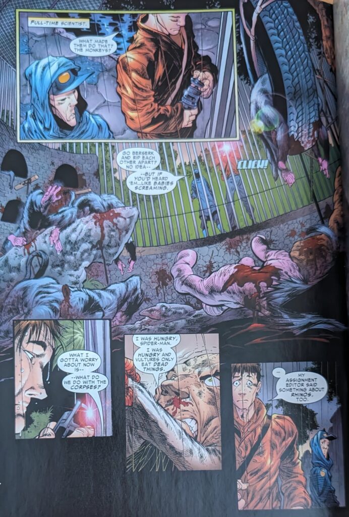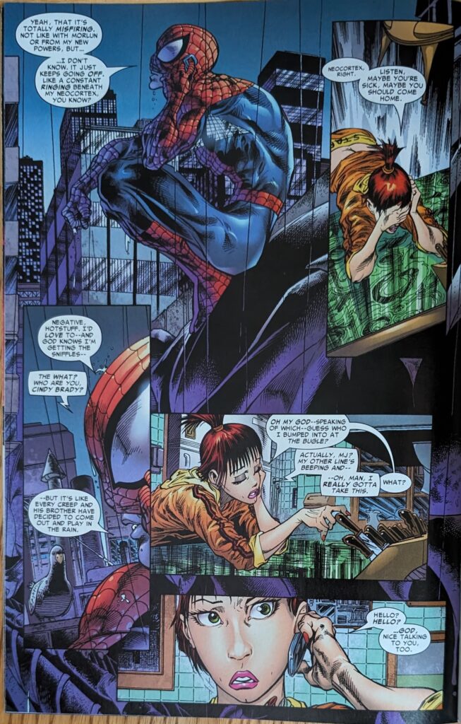 What are we doing? And why’d they drop the “Marvel Knights” if this book is gonna be a bunch of edgelord nonsense, that seems much more at home under “Marvel Knights” than Sensational Spider-Man. Meanwhile, Peter is riding the subway, and his Spider Sense goes off, leading him to a hideously drawn child who’s snuck a puppy onto the train, which she says is “real sick.” He has no idea why that triggered his danger sense, but I think we can see where this is going by now. Later, MJ is answering a call from Peter, and taking it into another room to hear better over a news report of some guys attacking another guy with machetes. Christ alive, did I hit my head? Is it 1992 all of a sudden?