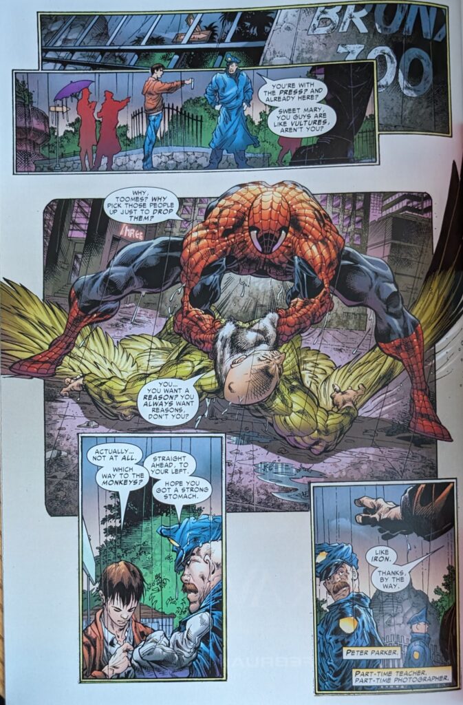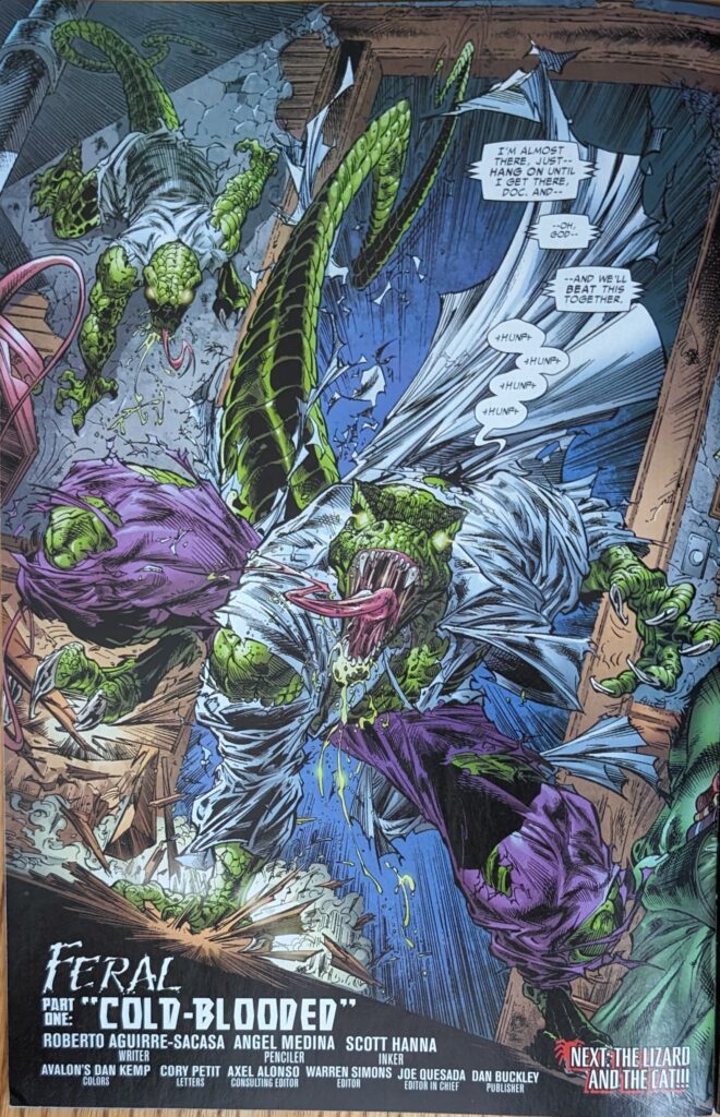 Guys, the prognosis is not good. Why do so many artists want the point on the inner sides of Spider-Man’s eyes to go down instead of up? Even Todd didn’t do that, but it becomes rampant in the 2000s, and still is. Later, at 5:30 in the morning, MJ finds Peter & May having coffee. May is her usual chipper self, but Peter is a zombie. Asked how he’s doing, he briefly flashes back to a hilariously brutal looking fight with the Vulture, as if that old man could take or dish out the massive hits Medina is rendering without shattering into a million pieces. Well, meanwhile, Curt Connors is working, when someone asks him to come “look at a rock” despite, you know, his field and all. Oh boy. Will Curt be the lunatic from Jenkins’ run, the actual Curt Connors, or something even worse?