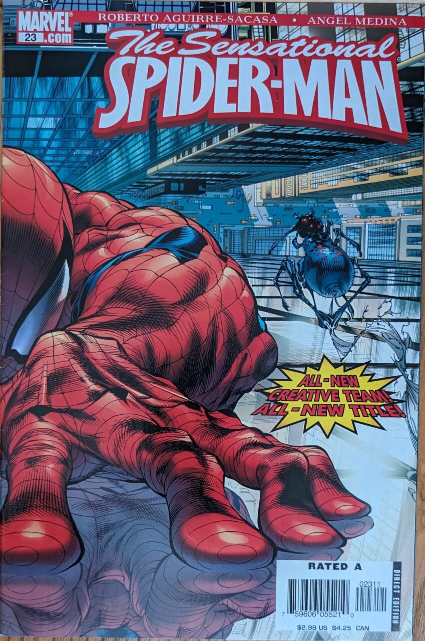 This month, Marvel Knights Spider-Man is suddenly Sensational Spider-Man. With the same numbering. 21st Century Marvel missing the opportunity for a new #1 is very surprising. Sensational Spider-Man starting at #23 seems much weirder. But I suppose I know why they did it. With a new name comes a new creative team. Roberto Aguirre-Sacasa signs on as writer. How he got pretty high profile Marvel gigs at this time is a bit of a mystery to me. He was sold to the readers as a famous playwright, one of Bill Jemas’ last “anyone from a more respectable field” hires before he himself was fired. His first Marvel gig was Marvel Knights 4, the FF concept Jemas tried to force on Mark Waid and Mike Wieringo that led to the PR disaster of them being fired and rehired. After that, Jemas’ silly pet project became a separate title. But from what I’ve read, Aguirre-Sacasa was only just starting out in the theatre at the time, having had just 2 works produced. Not exactly hiring “TV’s Alan Heinberg.” But his first play was about Archie of Archie comics, and got hit with a cease & desist, and that probably got him on Marvel’s radar. He’s actually gone on to develop the Riverdale TV show and even be CCO of Archie Comics, he must be a huge fan. As he takes over this book, he’s still writing that 4 book, as well as a disastrously wrong-headed Nightcrawler series with a horror bent. I bought that series and didn’t enjoy it at all. I’m very nervous about this. Joining him is Angel Medina, last seen around these parts unfortunately being made to draw cyberspace nonsense in ASM 406. Since then, tho, he’s done work for Todd McFarlane, where he illustrated many issues of Spawn spinoff Sam & Twitch for a young writer called Brian Michael Bendis. How ‘bout that? Like seemingly everyone who did work for Todd McFarlane up to that point, he absorbed some of McFarlane’s rendering style. His already very cartoony art was a good fit with McFarlane’s, but he took it even further. He’s inked by Scott Hanna and colored by “Avalon’s Dan Kemp.” As with Matt Milla, I’m left to wonder if Kemp was owned by Avalon the whole time, or was recently acquired. Good or bad, Aguirre-Sacasa is going to see this title out, and Medina is on for over a year, so here’s hoping it’s good. I never read it before. I was, in fact, reading no Spider-Man but USM in this moment. Not only did the Other convince me to drop ASM, the next thing in ASM convinced me to keep it that way. For 3 more months, anyway. So all 3 mainline titles are new to me until cover date July 2006. 7 months not reading any of the main Spider-Man titles was a previously unthinkable record for me in 2006… I sat through Maximum Carnage and the clone era, hating every minute and buying them, anyway. This was a new, mature me, who didn’t keep buying a product he wasn’t interested in. And now look at me. Owning them anyway. What a fool. Well, anyway. Let’s see what the Spider-Man comics of an Archie lovin’ playwright are like. Oh, right, this issue’s rather unusual cover layout is due to it being a wraparound.