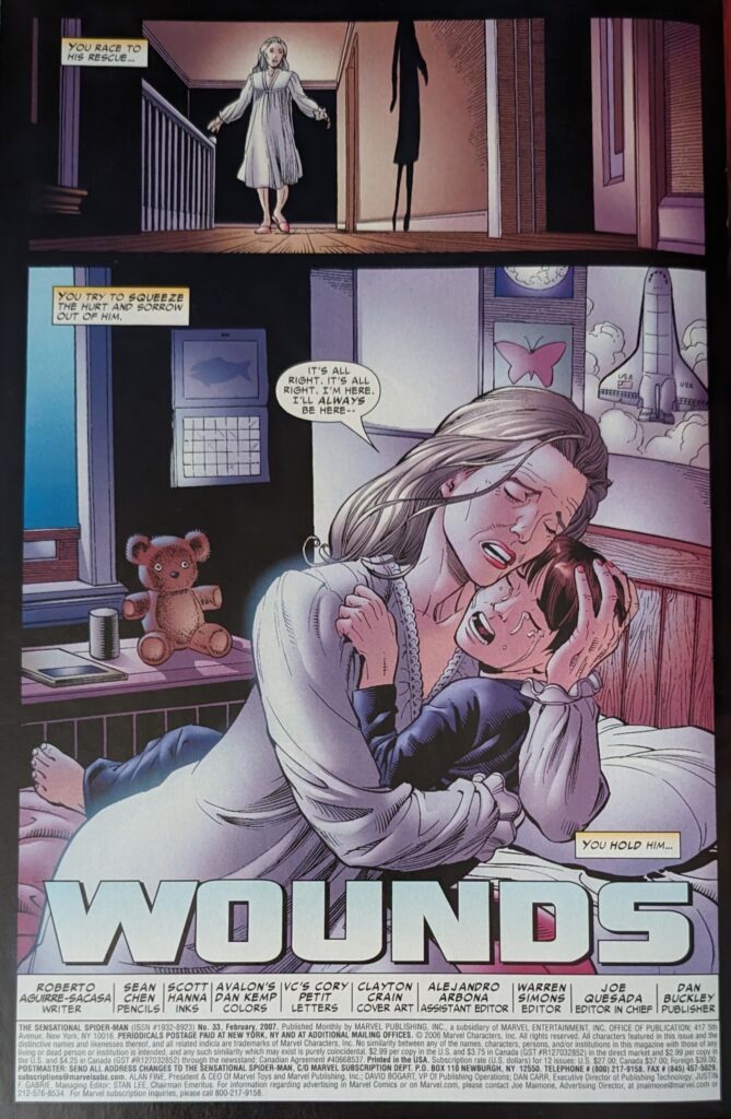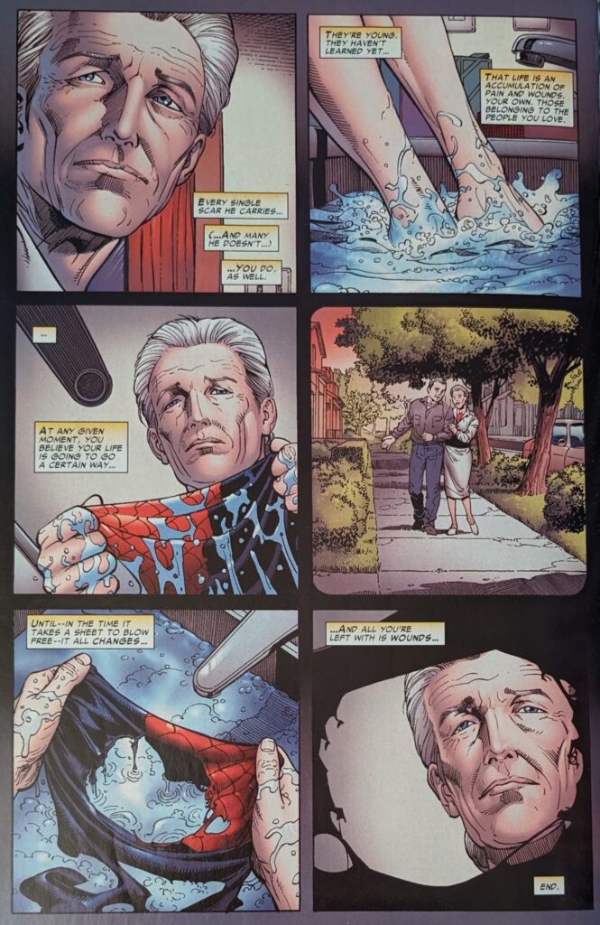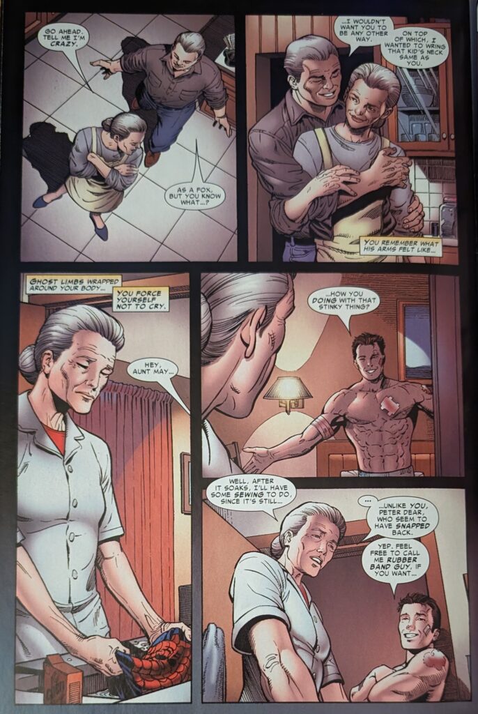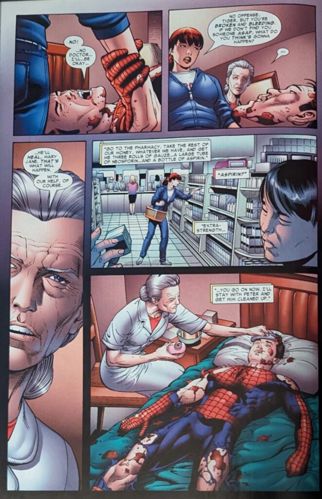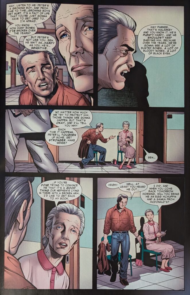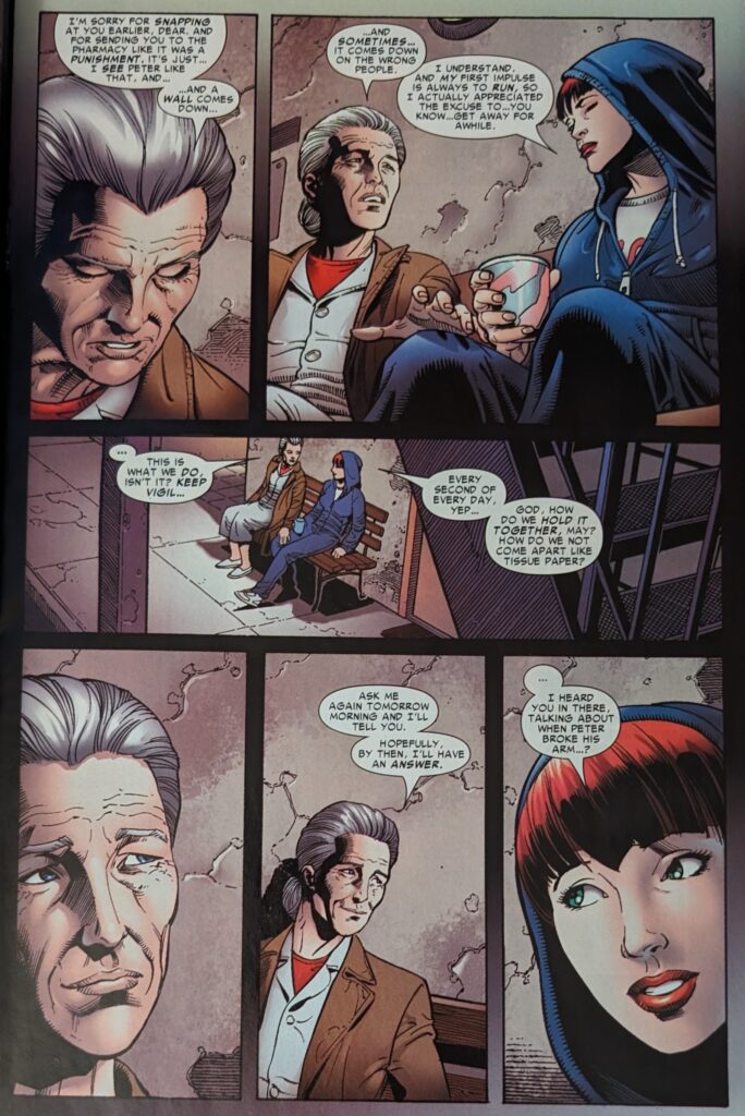 This leaves Peter & May to talk. He says he must look pretty bad, but she says she’s seen worse. He thinks she’s referring to when she saw him sleeping off Morlun and discovered his identity (With a flashback panel), but she’s thinking of an incident when he was a kid, when his heretofore unheard of friend Tommy Monks talked him into climbing a tree and he broke his arm. It was the first time May ever saw him hurt, and it shook her badly. She leaves Peter to get some rest and goes outside to find MJ dozing on a bench. She take a seat, and then they both try to start talking at once.