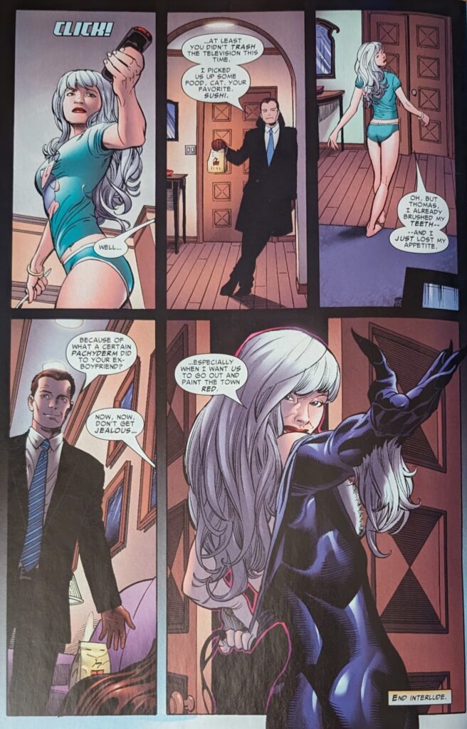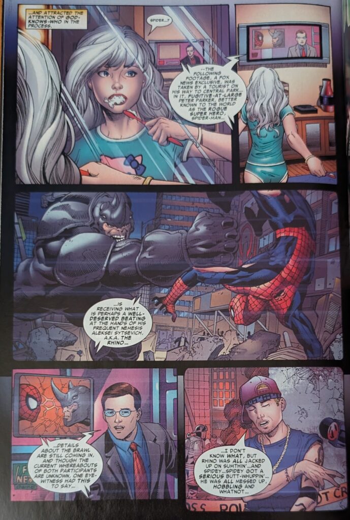 That takes us to the present, where we learn Peter got this severe beating from the Rhino, which is… hard to believe. I mean, sure, he could beat someone up real bad, but… he’s the Rhino. I’m not used to thinking of him as being so dangerous as long as you’re not a wall or a car.