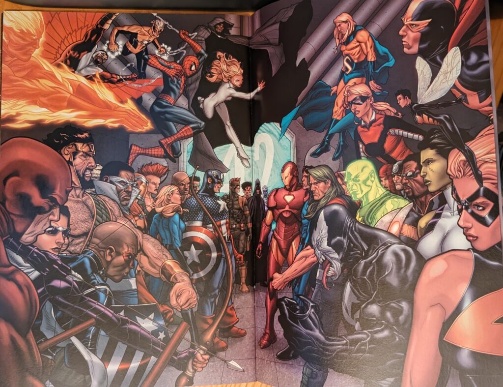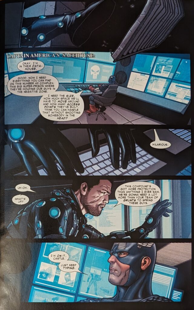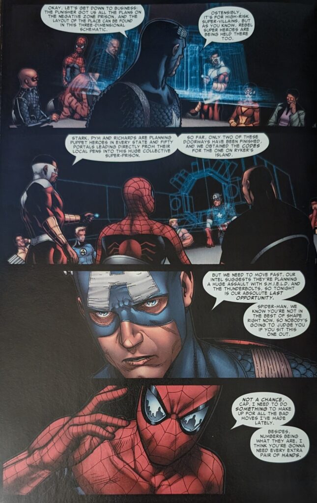 Cap sent Sue Richards to go try to sweet talk Namor into helping them, playing on his love for her. Namor sees right through that and is insulted Cap would send her instead of coming himself, and says no. He also says Namorita’s killer has been dealt with privately, a reference to the Wolverine tie-ins where he wound up meeting a gang of Atlanteans who helped him take down Nitro (And learned the corrupt new CEO of Damage Control more or less caused Stamford on purpose to win the contracts to clean up, which seems like a big deal, but I don’t think that plot point made it out of the Wolverine comic).