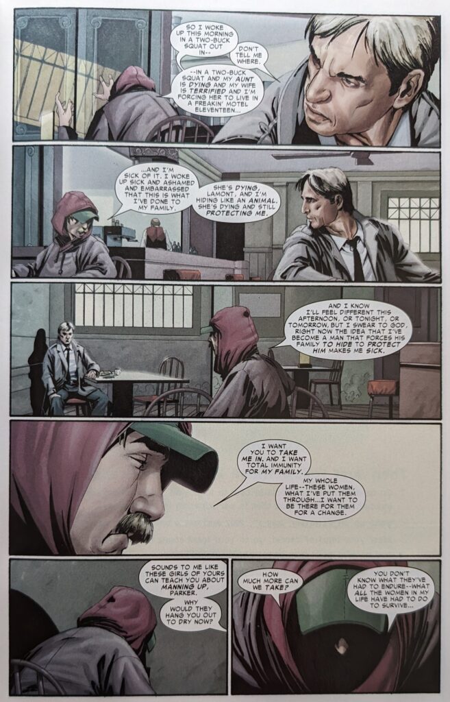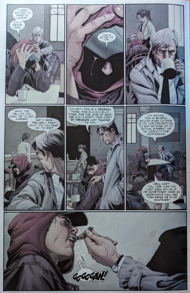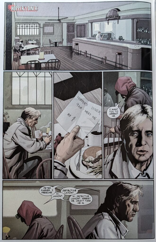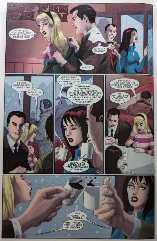 Peter flashes back told times again, saying even when they were kids, they all clung to each other for survival. That the guys were outclassed by the girls, who could play them like fiddles, and they just let them play. Which is just a fine bit of language and very Fraction and if I could, I think I’d run every page of this book. Back at the Coffee Bean, Brady tells MJ she & May get fully immunity if they turn in Peter. It’s time to put the “Spider-Nightmare” behind them. MJ says he doesn’t know what Peter’s lived through, what he’s lost and what it cost him. What it cost all of them. She talks more about how he was going through so much in the old days, and no one could offer him any relief or reassurance as the flashback officially becomes ASM 87, referenced a 2nd time in this period, Peter stumbling in on everyone to admit he’s Spider-Man in a daze. A comic I hadn’t read when this came out, by the way, it was kinda confusing!