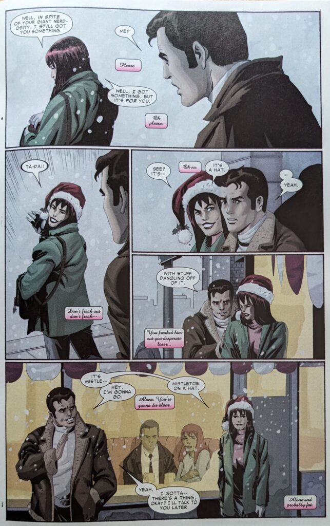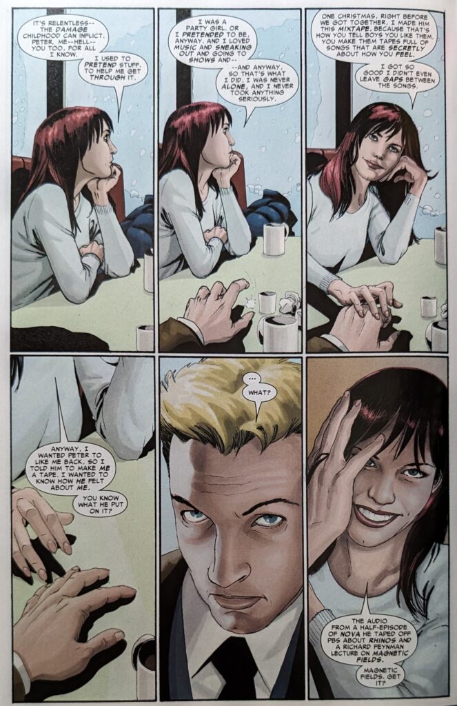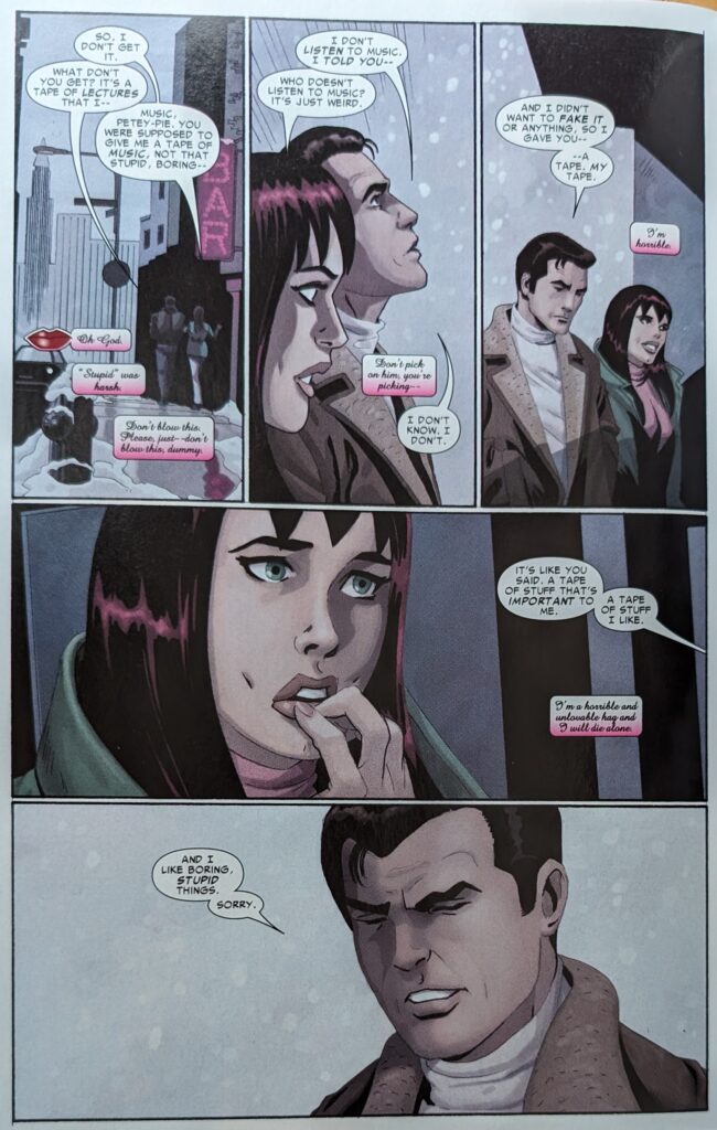 This is such a great Mary Jane, in the past and the present. Ugh, why didn’t Matt get a Spider-Man run?Peter is telling Lamont that the first thing MJ ever said to him was “Face it, Tiger, you just hit the jackpot.” Agrees with LAmont that that’s insane thing to say, but he couldn’t let her go. Maybe because he’s a scientist, the fact that he couldn’t explain her made her fascinating. Then they replay the mixtape scene with Peter’s internal monologue, freaking out, hoping she gets the “magnetic fields” reference, totally getting what the mistletoe is and running away because he panicked.