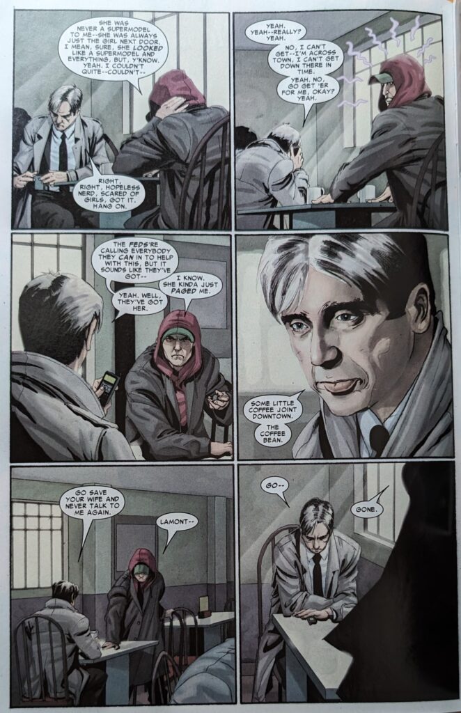 I wonder who Peter is. He’s gotta be somebody. We flashback to “earlier,” as MJ trying to get some coffee (At the Coffee Bean, no less) runs into a “Brady,” who seems to have been security for her in her modeling days in CA. They were apparently very close, almost romantic. MJ is happy to see him, but also paranoid about him drawing attention to her. This leads to our first classic era flashback, which is still LaRocca drawing, but now he’s doing “Tim Sale as John Romita, Sr.”, an extremely convoluted thing to do.