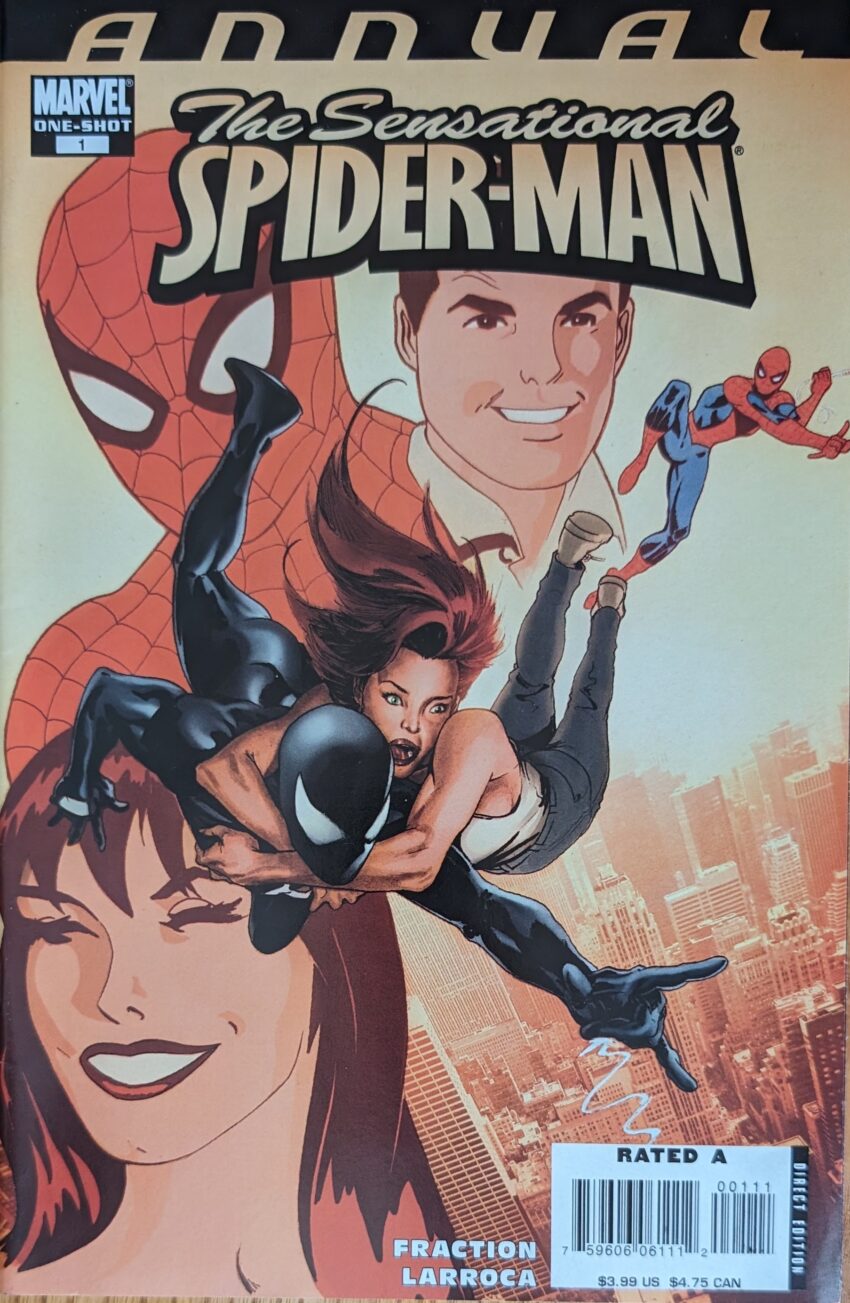 This annual is covered dated July 2007. It came out about halfway through the Back In Black period. That seems early for this. It seems much more appropriate here, as the final Back In Black comic. And so it is, because no one can stop me. Please welcome Matt Fraction back to the blog. Matt’s about to hit a homerun clean out of the park and really make you wish he’d written a Spider-Man comic. He is unfortunately joined by Salvador Larocca, who he will further unfortunately be joined by for a very long run of Iron Man comics with excellent stories and annoying, distracting celebrity tracing art. But that’s for later (We’re gonna see their 7th issue when we get to it due to you-know-who guest starring). This I bought when it came out, already an avowed Fraction fan from his Image comics The Five Fists of Science and Casanova, and having enjoyed that Punisher War Journal run to this point, and really enjoyed the Iron Fist run to this point (Which we sadly have no reason to look at). Paco Roca colors.