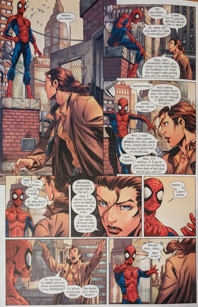 Oh, come on, Spidey and Kitty only JUST beat this guy up. It’s not funny if it’s 3 times a year. Spidey dispatched him, and when Spider-Man complains that Shocker never seems to stay in jail, a very weird looking Foggy Nelson appears to tell him he should take Shocker to a police station and file a report. So, at the police station, Jeannneenen Deee Wollfeeee (Had to do it once) is talking some cop out of trying to talk to SHIELD when Spider-Man rolls in with Shocker over his shoulder. De Wolfe says she’s been wanting to talk to him.