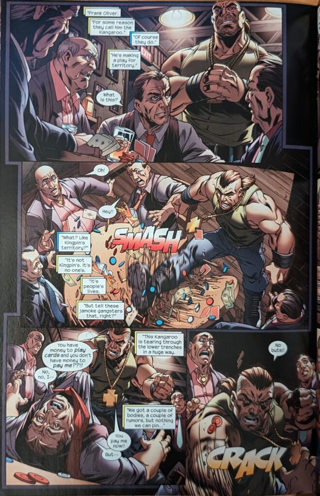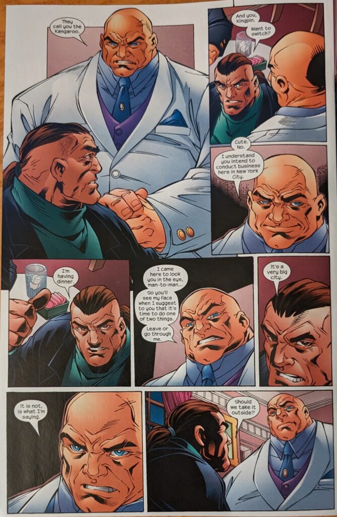 I don’t think anyone ever thought we’d get an Ultimate Kangaroo. But life comes at you fast. Jeanne calls her boss, who is dining with a senator, and informs him Spider-Man has been sent to deal with the Kangaroo for them. So, we find our hero scoping out a place, feeling like this whole situation is wrong, but arguing with himself about it. Until a guy comes flying through a plate glass window, and then his decision is made for him.