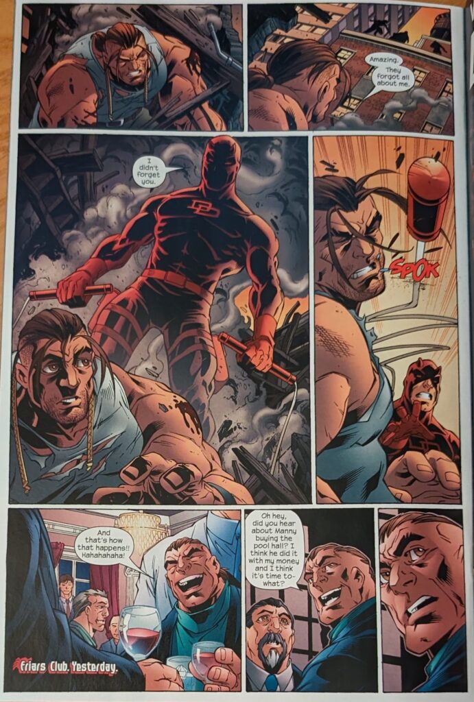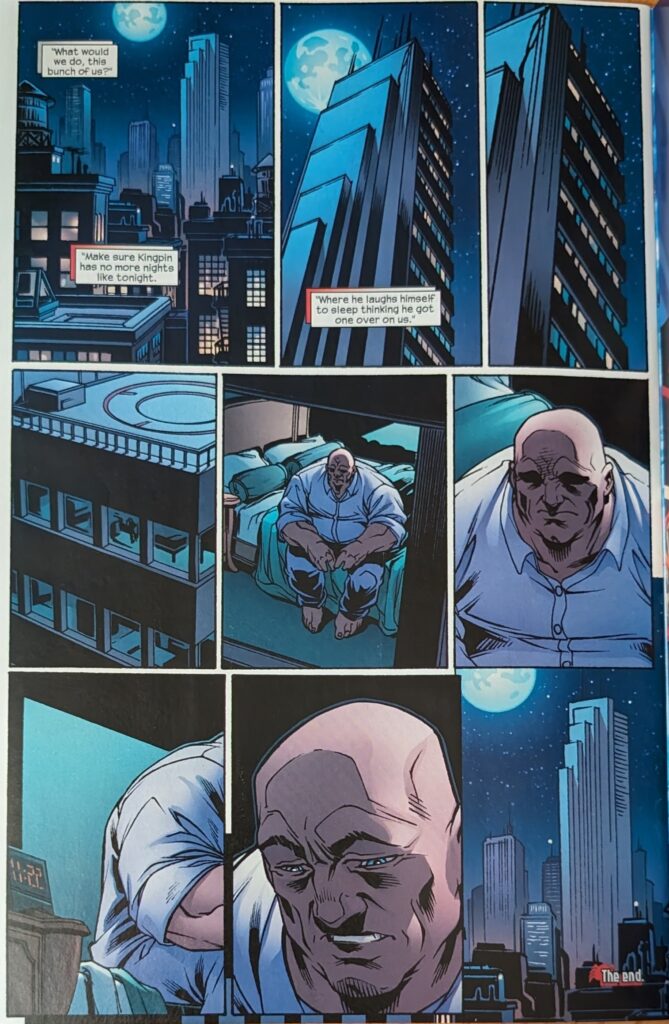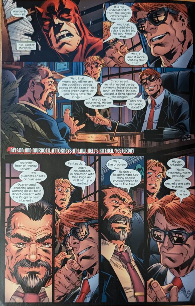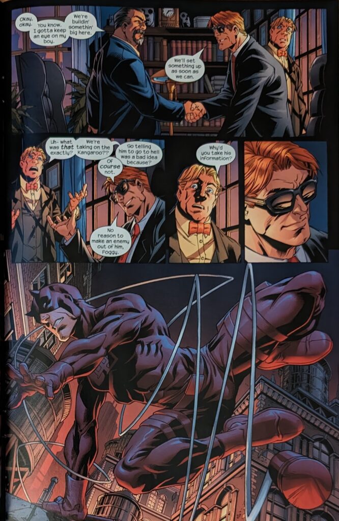Ouch. Weird how DD eased up on our boy there, a bit. Later, DD had snuck into Moon Knight’s sanctuary, because he thinks MK is on the up & up, and he has a proposition for him. Kingpin and his ilk have armies, and these hero-types are starting to get in each other’s way. But DD is proposing a team.