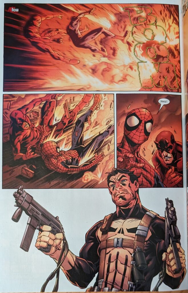 He’s so mad all the time. I think this must take place before USM 96, despite it being published 2 months after. Whoops. That flashback ends with Foggy wanting to know why Matt took that guy’s info when they’re obviously not going to help him. Matt says there’s no reason to make an enemy of the guy, and then DD is off to fight Kangaroo in the present. In the heat of all that, in their own ways, Spidey and DD suddenly realize Punisher is on a nearby roof, and he shoots a rocket at the bar. That’s rude. Flashback to Frank in prison yesterday when a guy says he’s getting out today and his cousin, the Kangaroo, is coming to get him so they can go do terrible things, and Frank killing him, of course, before being tased and then escaping from his infirmary bed (somehow).
