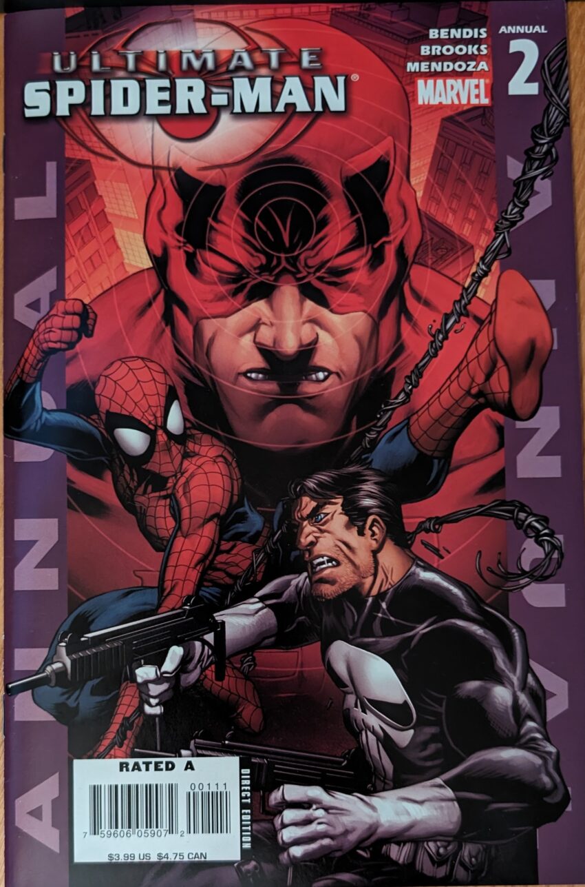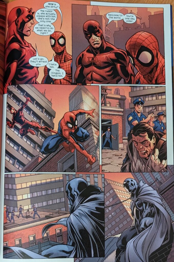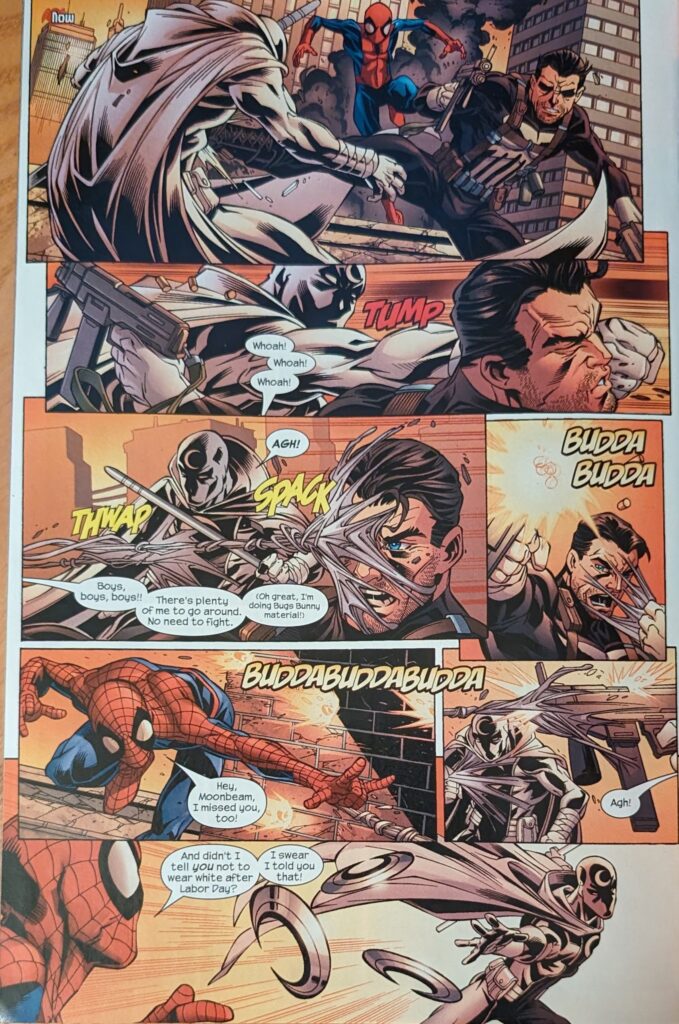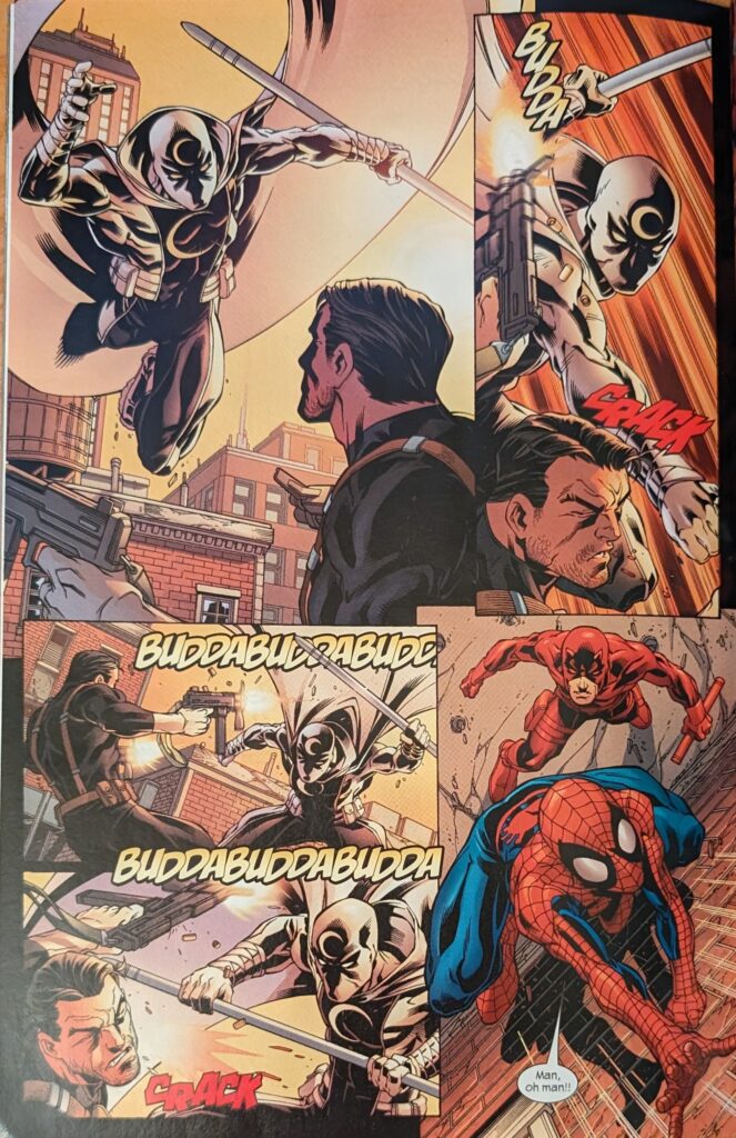 The gang’s all here! Flashback to Moon Knight’s multiple personalities getting together to wake him up and help him flee the hospital before hooking up with his gal, Martene, who I guess is sort of his Alfred in the Ultimate U, and him recommitting to being a vigilante. Then on with the show.