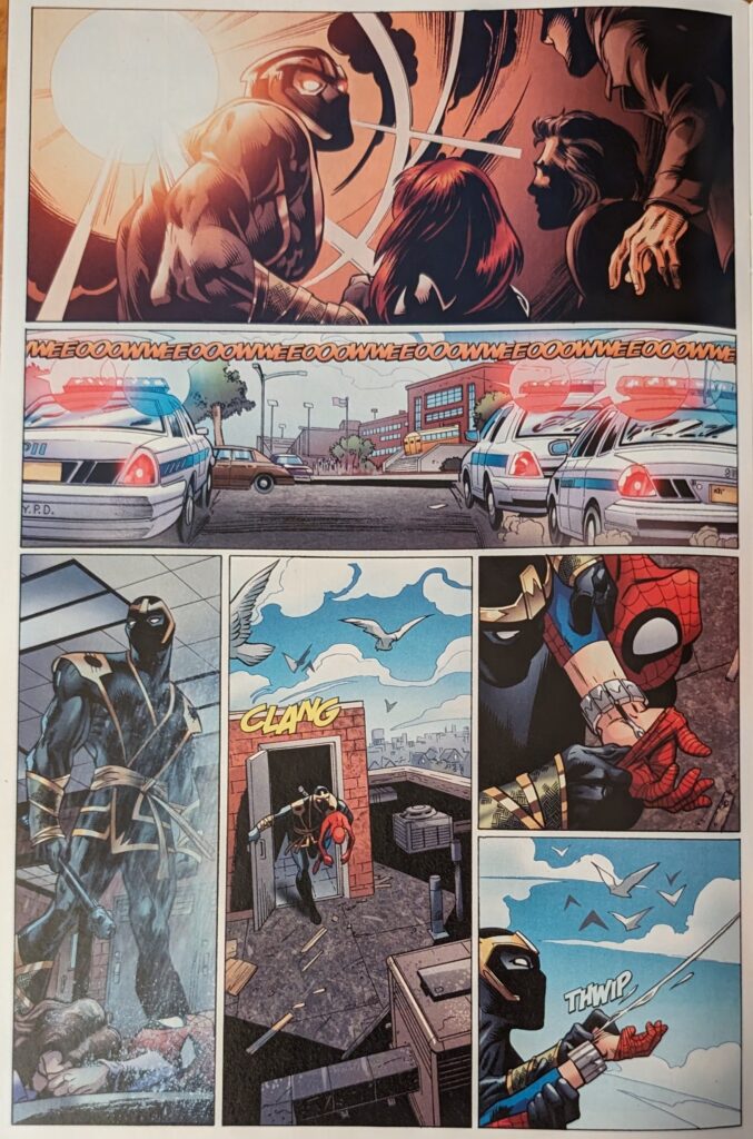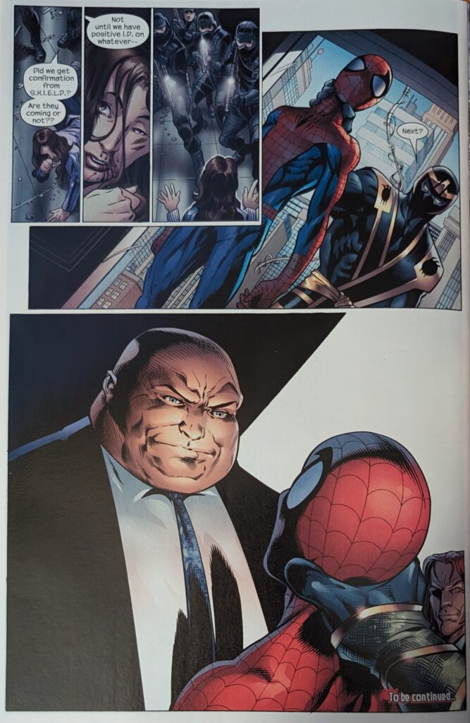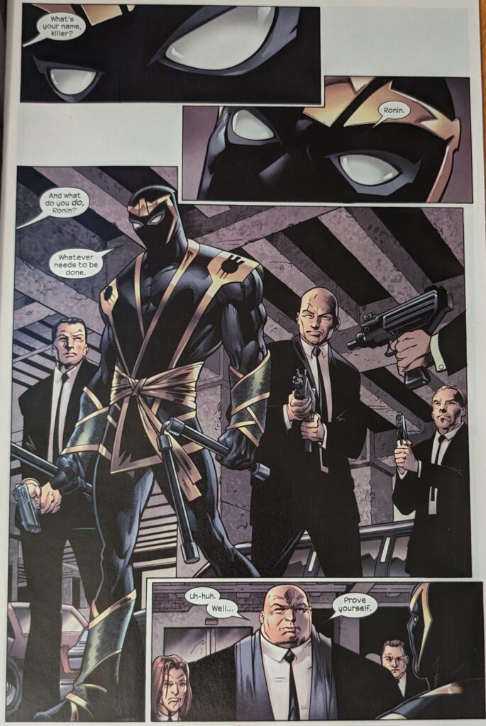 Every Ronin is revealed faster than the previous one. I guess that’s a Ronin Rule. Ronin starts taking Fisk’s goons apart, but he says that’s not what he had in mind. Rose says he’s Marc Spector, “Gulf War Super Soldier experiment gone wrong,” who formerly worked for Roxxon under the name “Paladin.” Who knows, that could all be true. Kingpin gives him the task to prove himself: “Spider-Man. Wreck his life and bring him here.”