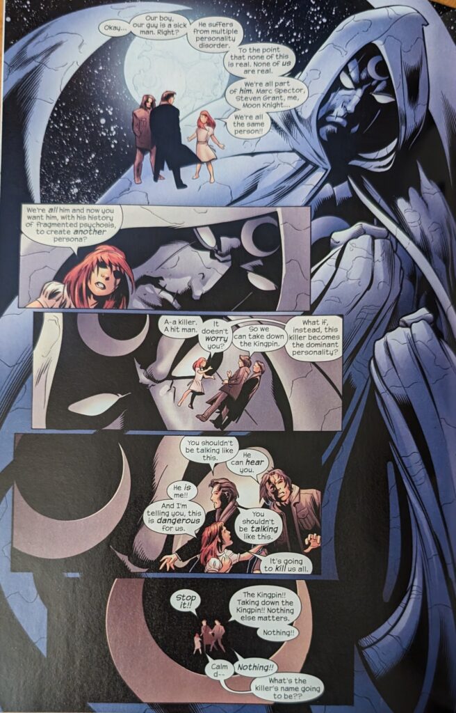 Feel like Bendis is just goofing now. Ultimate Ronin! Page one, Kingpin is looking in on his bedridden wife. Probably Vanessa, but it could be any name in this world. Maybe he said it back when she was introduced and I have forgotten. His new majordomo, Mr. Rose, one assumes an international reference, intrudes, and is given a warning this one time only. He wants Fisk to know the candidate for his “fist” is here. In Moon Knight’s mind, his personalities try to get him ready for it.