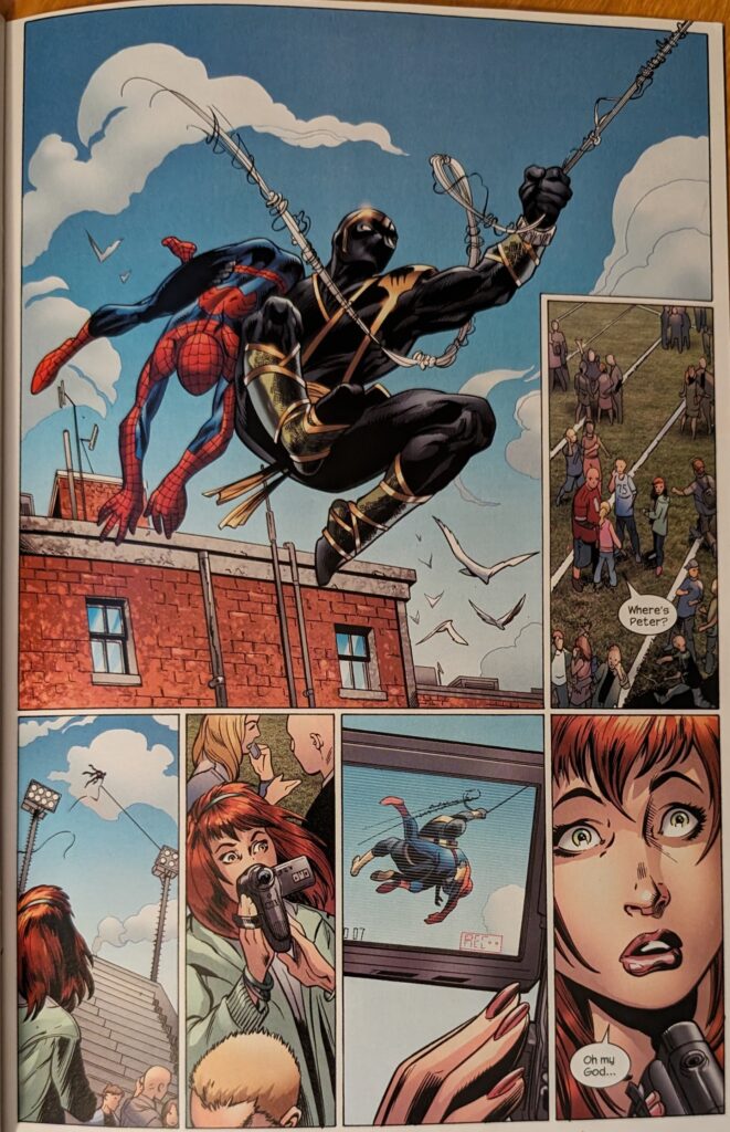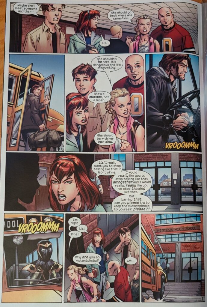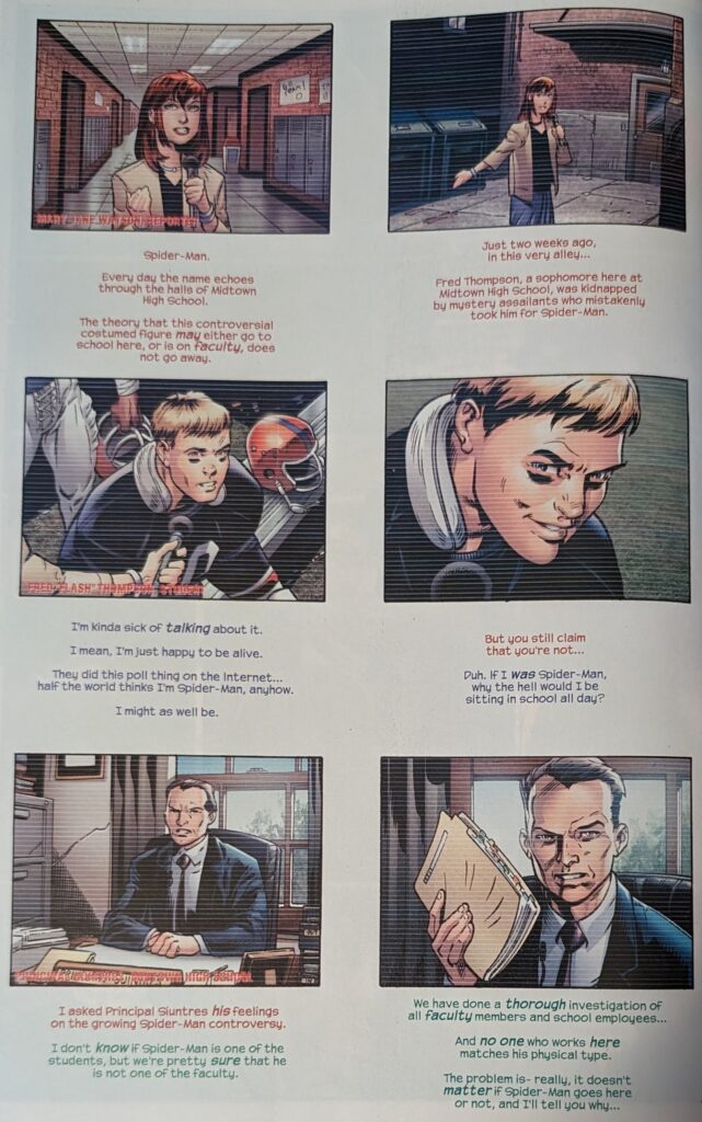 Why is Paul Schaefer running the school news channel? Is the Late Show Orchestra, né the World’s Most Dangerous Band there, also? Seems like there could be a rivalry between MJ and Jessica Jones now. Later, MJ & Peter are having a fun chat about her using him to get her new gig when Kitty accidentally walks up. Peter tries to introduce her to MJ, but she flees. They both feel bad about it.